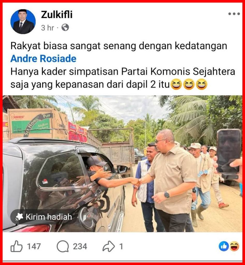 “Rakyat biasa sangat senang dengan kedatangan Andre Rosiade. Hanya kader simpatisan Partai Komonis Sejahtera saja yang kepanasan dari dapil 2 itu😆😆😆,” tulis Zulkifli.