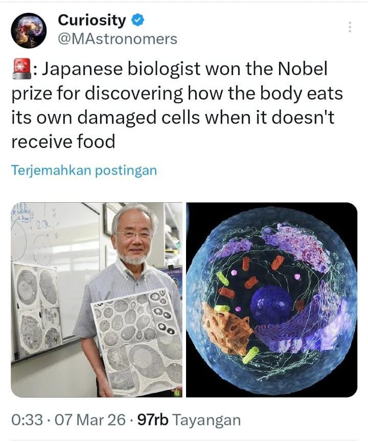 🚨 Ahli biologi Jepang memenangkan hadiah Nobel karena menemukan “bagaimana tubuh memakan sel-selnya yang rusak ketika tidak menerima makanan”.