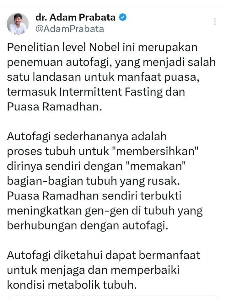 Penelitian level Nobel ini merupakan penemuan autofagi, yang menjadi salah satu landasan untuk manfaat puasa, termasuk Intermittent Fasting (diet puasa) dan Puasa Ramadhan.