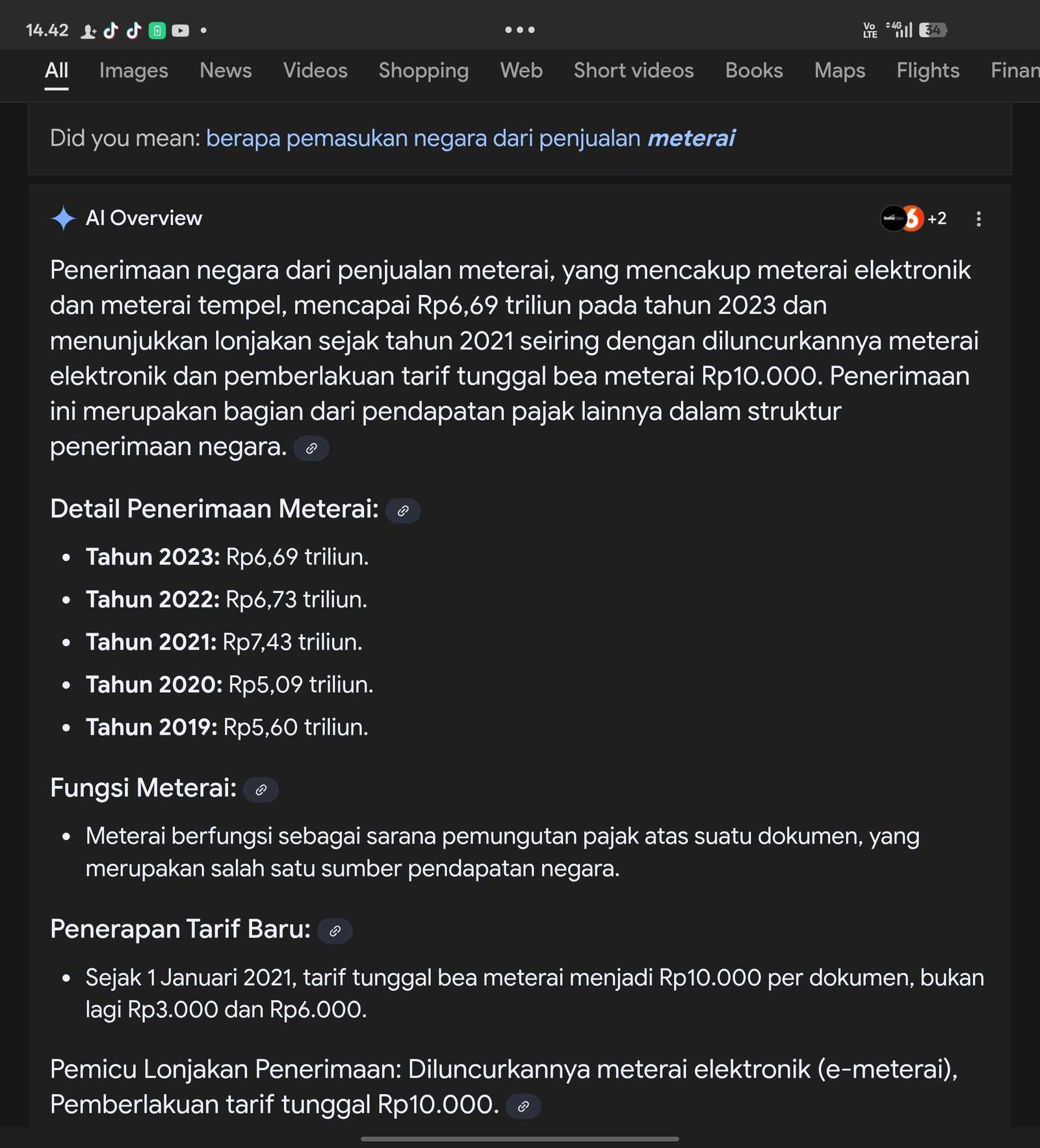 Penerimaan ini mengalami peningkatan signifikan sejak peluncuran meterai elektronik dan pemberlakuan tarif tunggal Rp 10.000 pada tahun 2021.