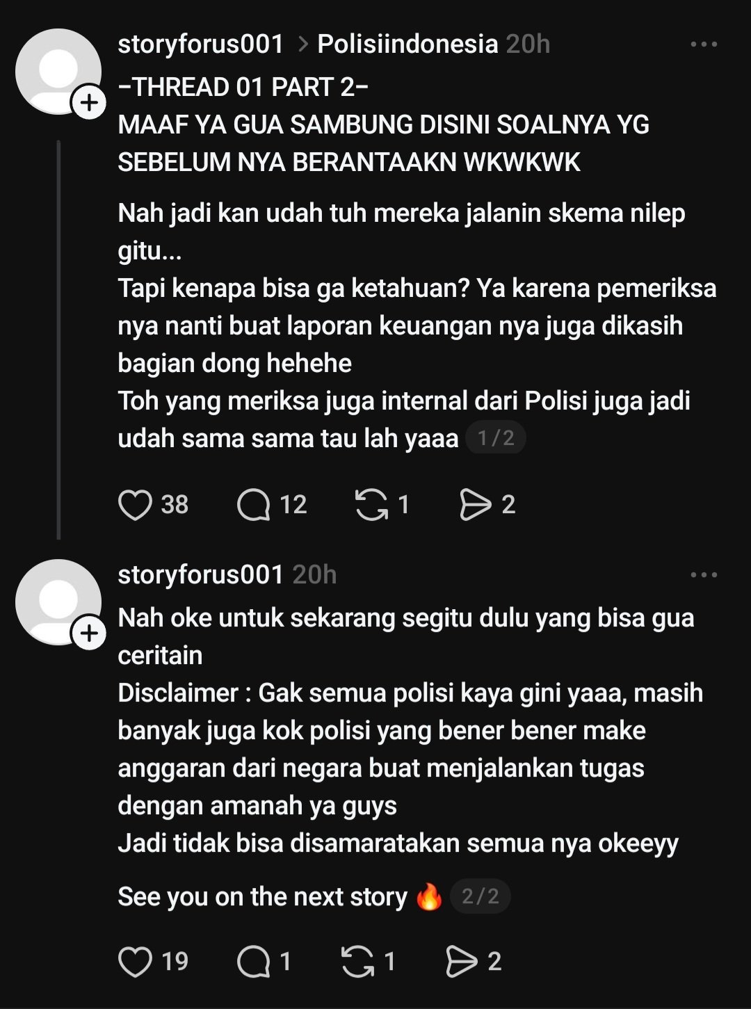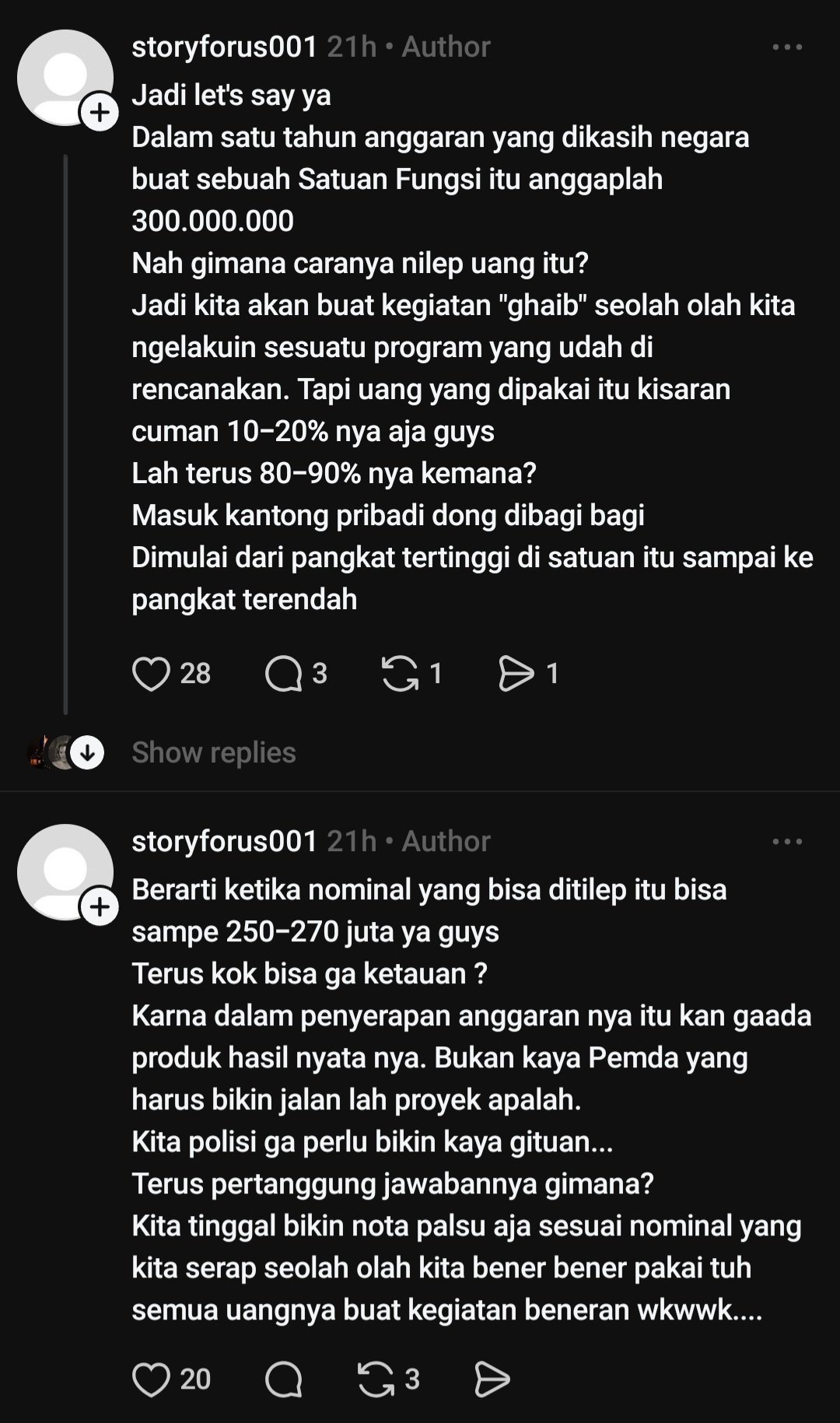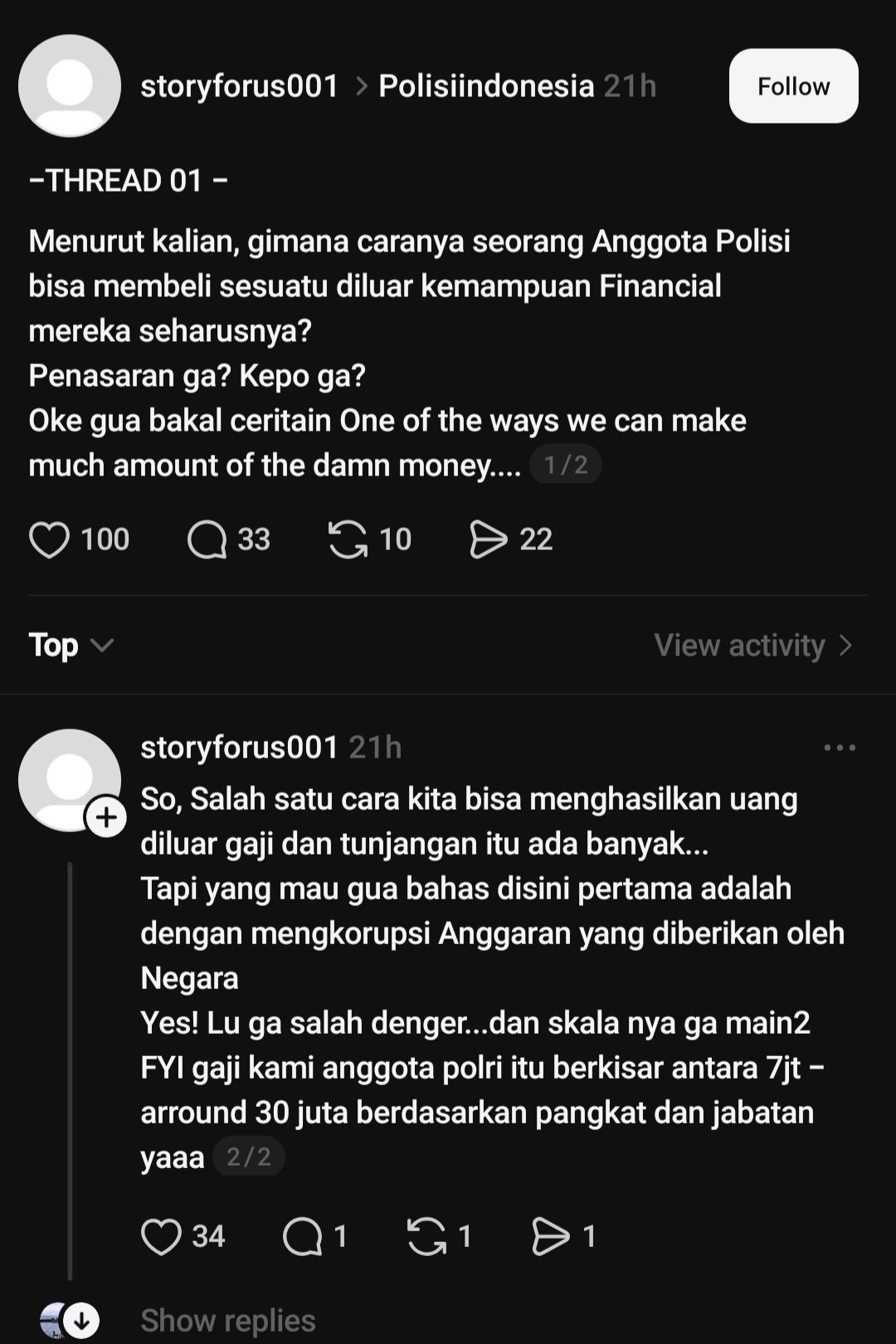 Di THREAD (media sosialnya Instagram) ada orang yang mengaku anggota polisi kemudian membeberkan suka dukanya. Dia cerita bagaimana polisi bisa membeli sesuatu diluar kemampuan finansialnya (gaji 7-30jt). Menurutnya, mereka bisa dapet duit dari korupsi proyek. Proyek 300jt ditilepnya 250-270jt 😱