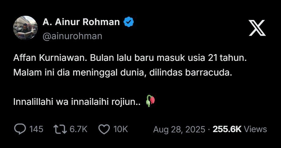 Hari ini kita tahu bahwa nasib Affan menjadi lain. Seperti banyak rakyat yang merasakan semakin sulitnya mencari kehidupan saat ini dan suramnya masa depan, ia ada di kalangan demonstran yang berunjuk rasa bersama buruh. Demo ini ditanggapi dengan brutalitas yang berlebihan oleh polisi.