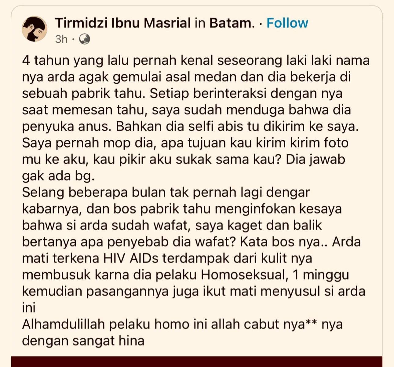 4 tahun yang lalu pernah kenal seseorang laki laki namanya arda agak gemulai asal medan dan dia bekerja di sebuah pabrik tahu. Setiap berinteraksi dengannya saat memesan tahu, saya sudah menduga bahwa dia penyuka anus. Bahkan dia selfi abis tu dikirim ke saya. Saya pernah mop dia, apa tujuan kau kirim kirim foto mu ke aku, kau pikir aku sukak sama kau? Dia jawab gak ada bg. Selang beberapa bulan tak pernah lagi dengar kabarnya, dan bos pabrik tahu menginfokan kesaya bahwa si arda sudah wafat, saya kaget dan balik bertanya apa penyebab dia wafat? Kata bos nya.. Arda mati terkena HIV AIDs terdampak dari kulit nya membusuk karna dia pelaku Homoseksual, 1 minggu kemudian pasangannya juga ikut mati menyusul si arda ini. Alhamdulillah pelaku homo ini allah cabut nya** nya dengan sangat hina.