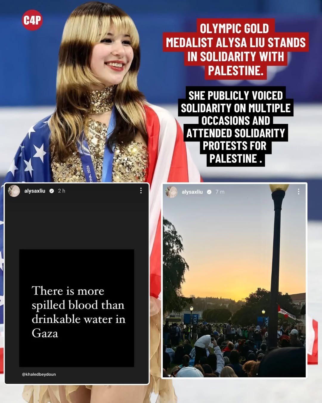 Alysa Liu mencetak sejarah di Olimpiade Musim Dingin Milano Cortina 2026 sebagai wanita Amerika pertama dalam 24 tahun yang memenangkan medali emas tunggal putri cabang seluncur indah (figure skating). Selain prestasi olahraganya, ia juga dikenal karena keberaniannya menyuarakan isu-isu kemanusiaan, termasuk solidaritas terhadap Palestina.