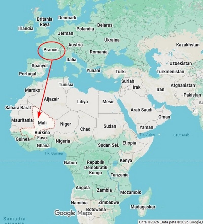 Mali adalah negara miskin di Afrika barat yang selama puluhan tahun dirampok oleh Perancis. Hanya presiden dan kroni-kroninya yang dibikin kaya raya.