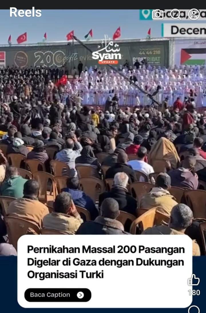 Pernikahan massal yang melibatkan sekitar 200 pasangan (tepatnya 203 pasangan) di Jalur Gaza baru saja dilaksanakan pada 18 Desember 2025 dengan dukungan dari lembaga kemanusiaan Turki.