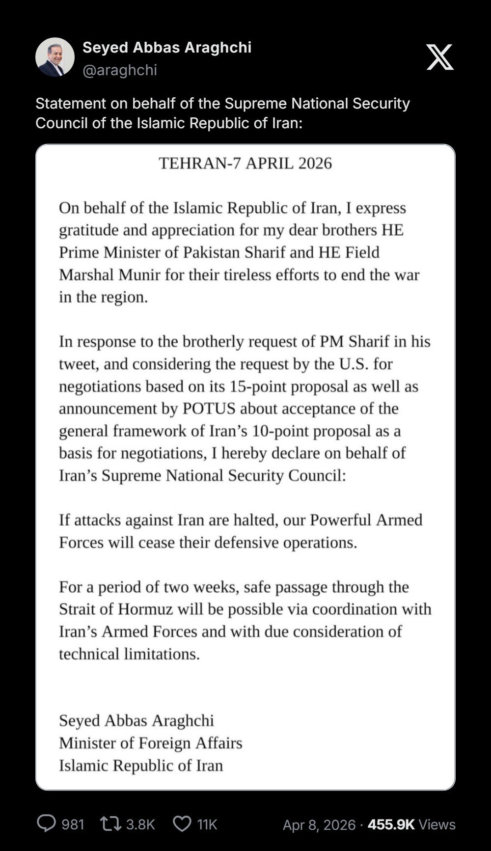 Menanggapi permintaan persaudaraan PM Sharif dalam cuitannya, dan mempertimbangkan permintaan AS untuk negosiasi berdasarkan proposal 15 poinnya serta pengumuman oleh Presiden AS tentang penerimaan kerangka umum proposal 10 poin Iran sebagai dasar negosiasi, dengan ini saya menyatakan atas nama Dewan Keamanan Nasional Tertinggi Iran: