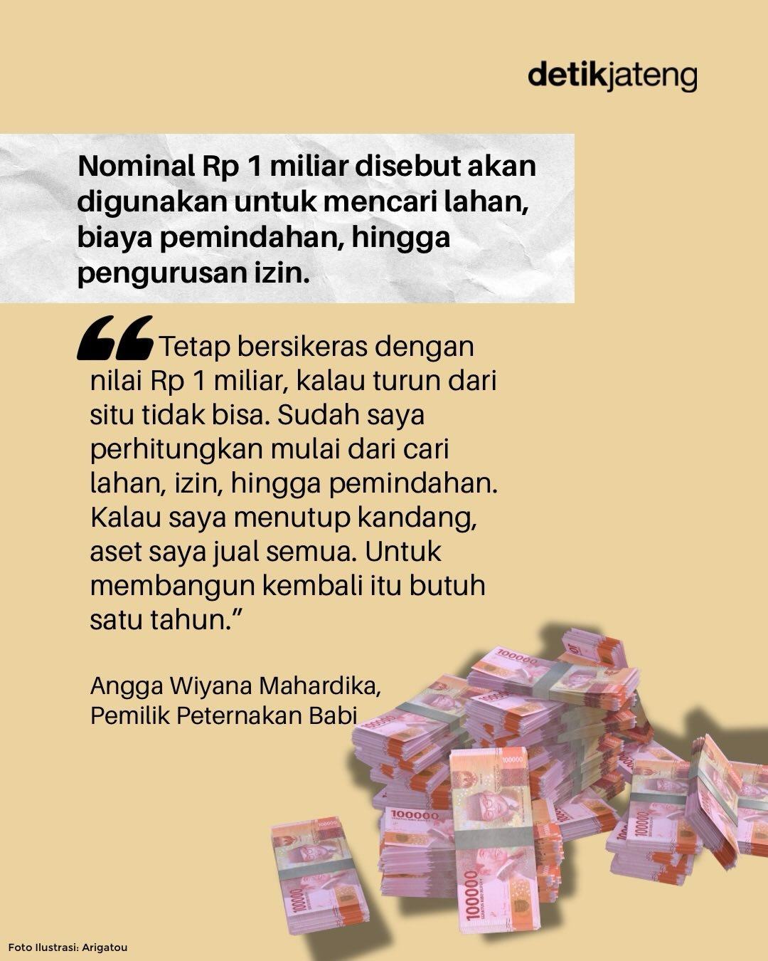“Tetap bersikeras dengan nilai Rp 1 miliar, kalau turun dari situ tidak bisa. Sudah saya perhitungkan mulai dari cari lahan, izin, hingga pemindahan. Kalau saya menutup kandang, aset saya jual semua. Untuk membangun kembali itu butuh satu tahun,” pungkasnya.