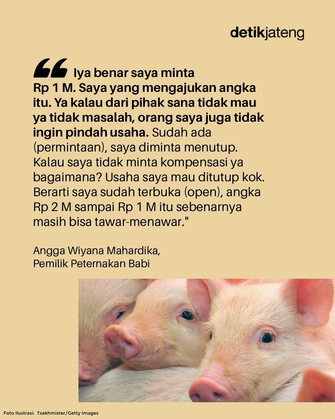 “Beliau minta kompensasi untuk memindah kandang babi. Itu kita sebetulnya saat itu sudah kulonuwun (permisi) juga dan dimediasi oleh pihak setempat. Ternyata beliau mintanya Rp 2 miliar saat itu. Lalu kemarin katanya diturunkan jadi Rp 1,5 miliar dan sekarang bilang Rp 1 miliar,” kata Aan, kemarin.
