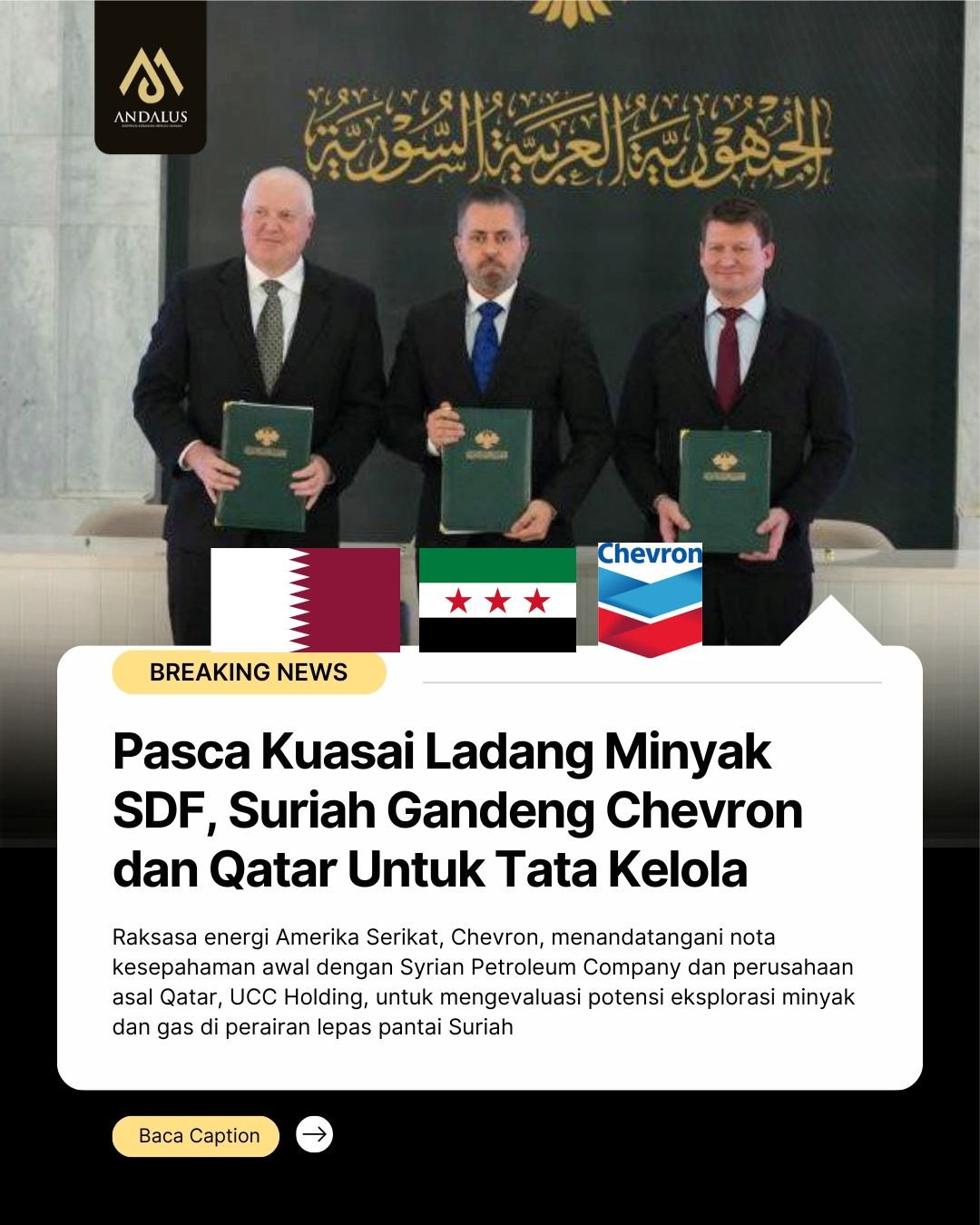 Salah satu sinyal terkuat datang dari kesepakatan awal antara raksasa energi Amerika Serikat, Chevron, dengan Syrian Petroleum Company dan perusahaan Qatar, UCC Holding, untuk mengevaluasi potensi eksplorasi minyak dan gas di perairan lepas pantai Suriah.