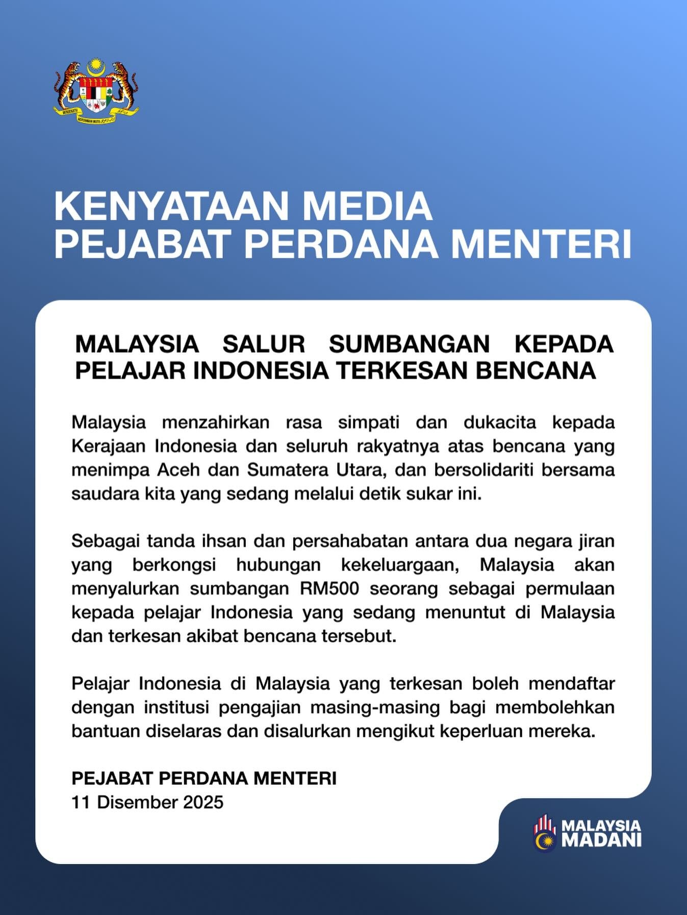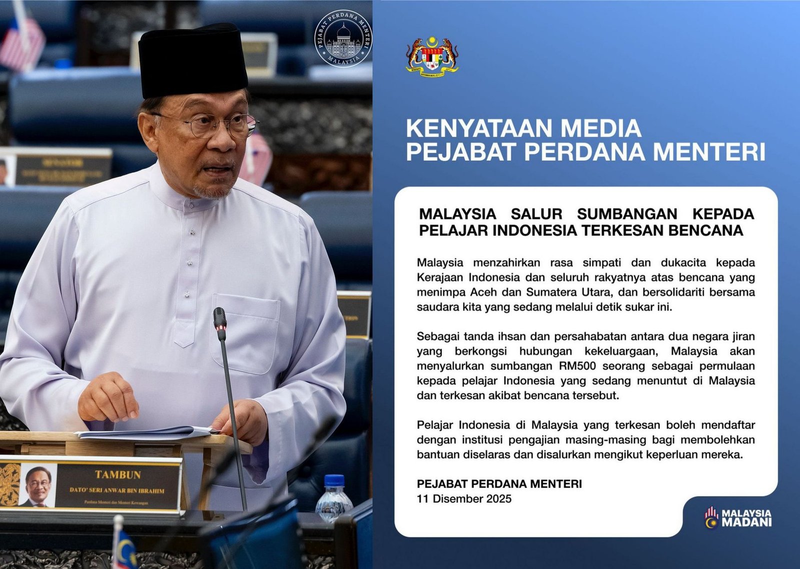 PM Malaysia Anwar Ibrahim memberikan uang saku bagi pelajar Indonesia di Malaysia yang terdampak bencana Sumatera sebesar RM 500 (sekitar Rp2 juta per orang).