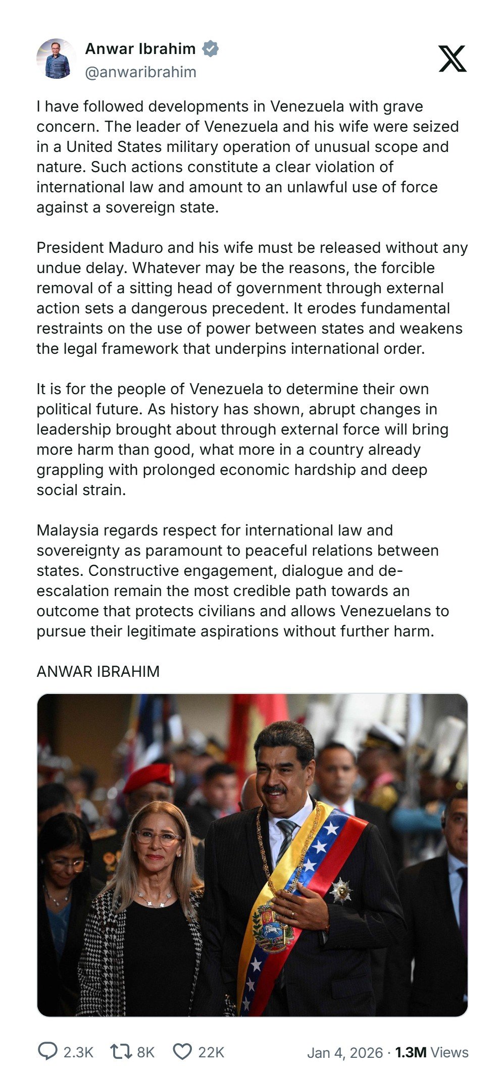 Malaysia menganggap penghormatan terhadap hukum internasional dan kedaulatan sebagai hal yang terpenting untuk hubungan damai antar negara. Keterlibatan konstruktif, dialog, dan de-eskalasi tetap menjadi jalan paling kredibel menuju hasil yang melindungi warga sipil dan memungkinkan warga Venezuela untuk mengejar aspirasi sah mereka tanpa membahayakan lebih lanjut.