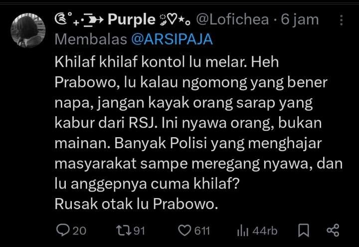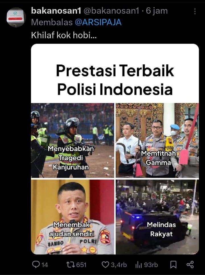 Presiden Prabowo Subianto menyebut anggota kepolisian dapat melakukan kesalahan dalam melaksanakan tugasnya. Itu berkaitan dengan adanya korban sipil dari tindakan pengamanan yang dilakukan oleh anggota polri dalam aksi unjuk rasa beberapa hari terakhir yang berujung ricuh dan menewaskan warga sipil.