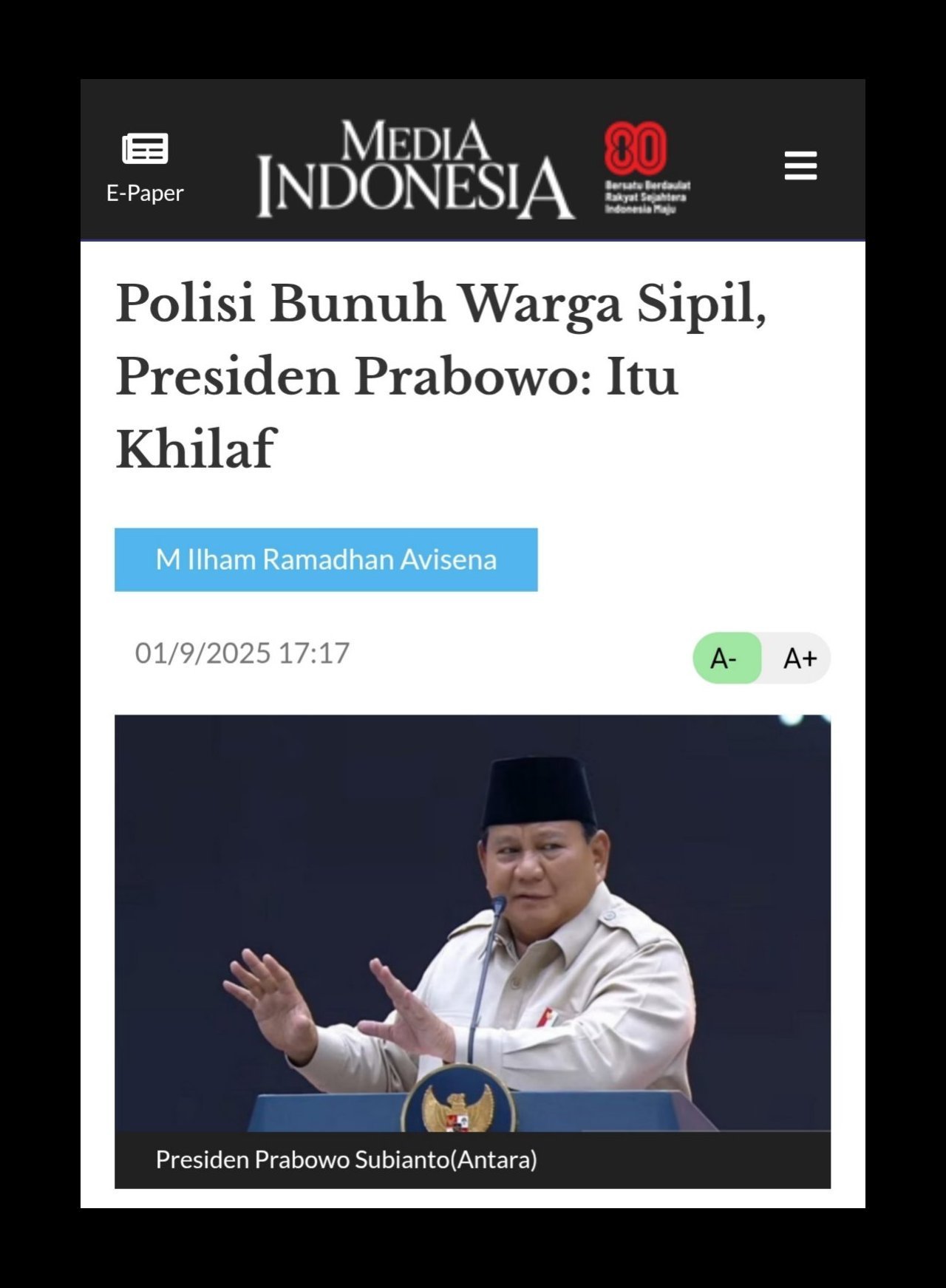 Presiden Prabowo Subianto menyebut anggota kepolisian dapat melakukan kesalahan dalam melaksanakan tugasnya. Itu berkaitan dengan adanya korban sipil dari tindakan pengamanan yang dilakukan oleh anggota polri dalam aksi unjuk rasa beberapa hari terakhir yang berujung ricuh dan menewaskan warga sipil.