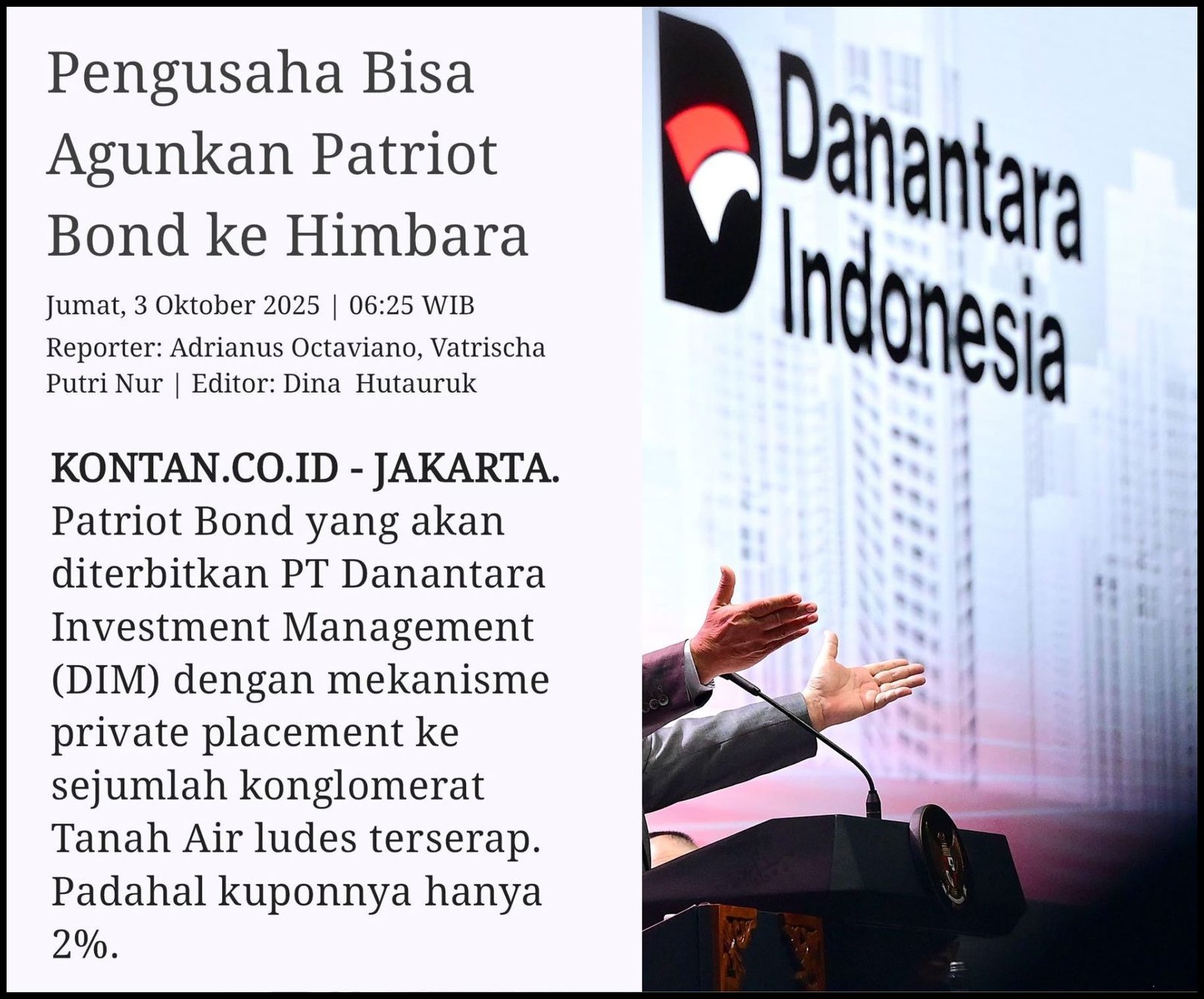 Memang kuponnya hanya 2%, kalah dari rata-rata kupon Surat Berharga Negara (SBN) untuk tenor dua tahun sebesar 5% dan lima tahun 5,5%. Tapi kabar terbaru menyebutkan ternyata Patriot Bond bisa diperdagangkan dan dijadikan agunan di bank-bank Himbara seperti BRI, BTN, Mandiri, dan BNI (Kontan, 3/10/2025).