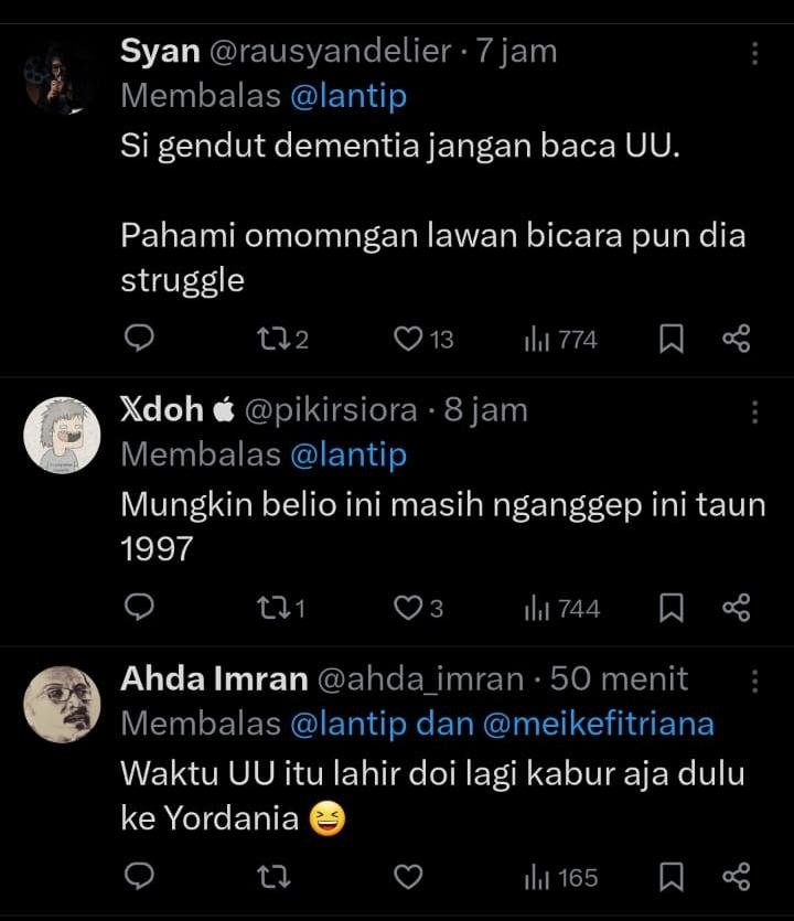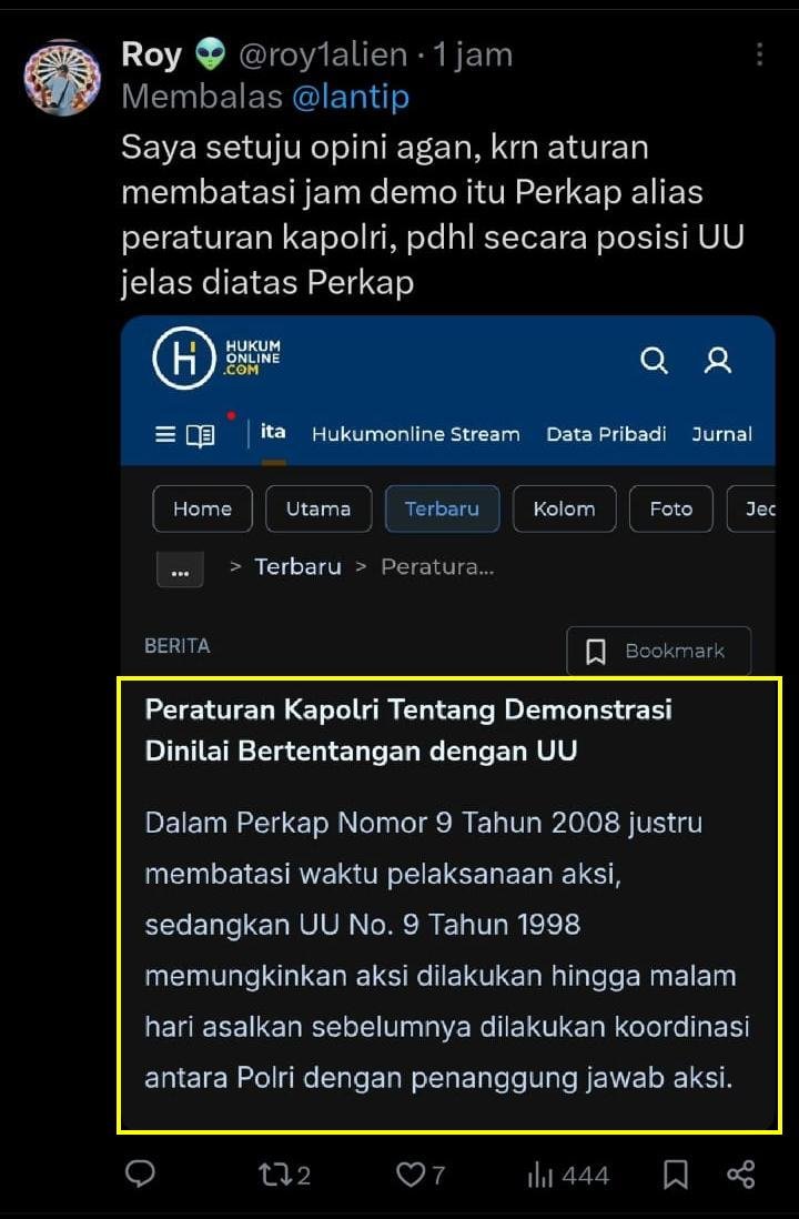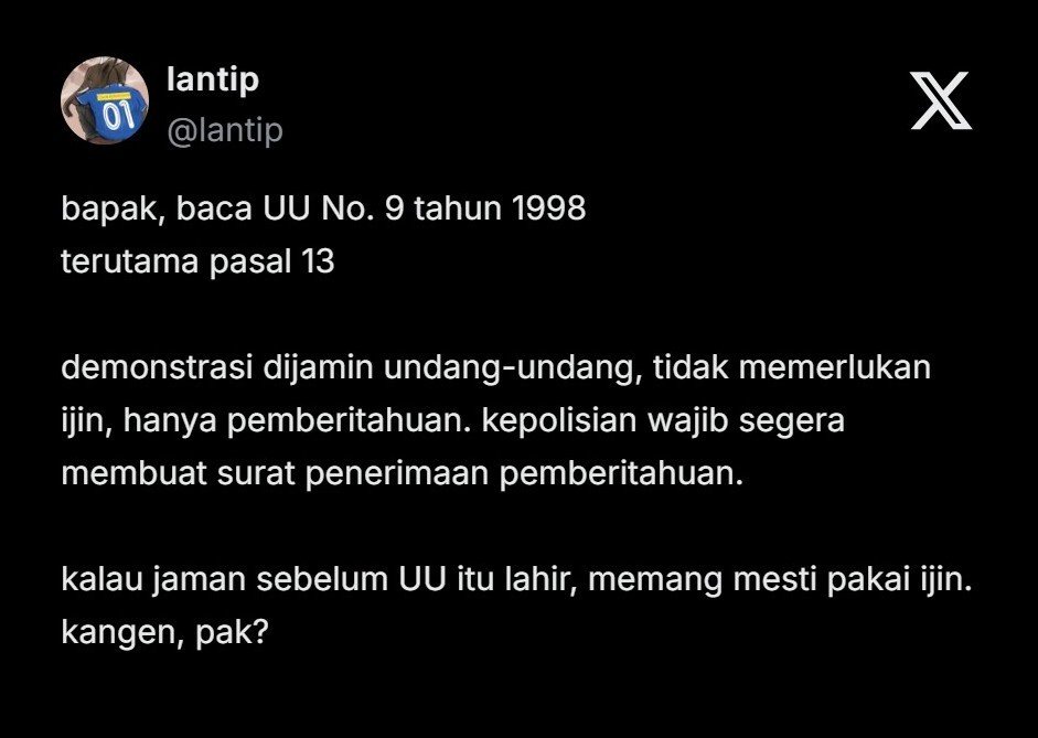 “Bapak, baca UU No. 9 tahun 1998, terutama pasal 13. Demonstrasi dijamin undang-undang, tidak memerlukan ijin, hanya pemberitahuan. Kepolisian wajib segera membuat surat penerimaan pemberitahuan. Kalau jaman sebelum UU itu lahir, memang mesti pakai ijin. Kangen, pak?” sentil akun X @lantip.