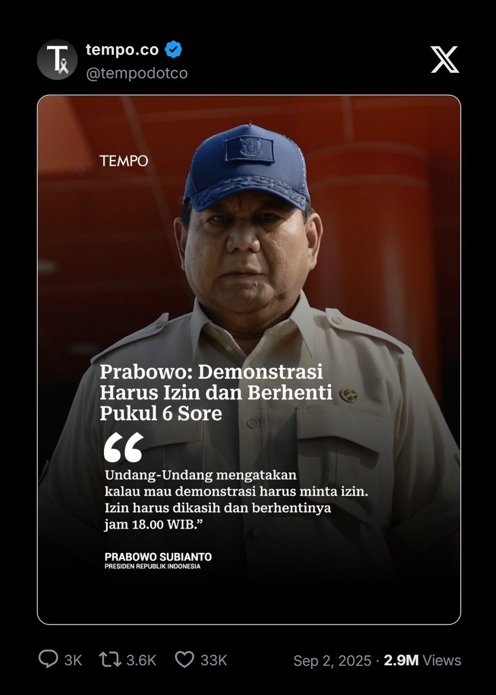 Namun ia mengingatkan demonstrasi harus mengikuti aturan dan sesuai undang-undang. βUndang-Undang mengatakan kalau mau demonstrasi harus minta izin dan izin harus dikasih dan berhentinya jam 18.00 WIB,β kata Prabowo saat mengunjungi Rumah Sakit Polri, Kramat Jati, Jakarta, Senin, 1 September 2025, dilansir TEMPO.