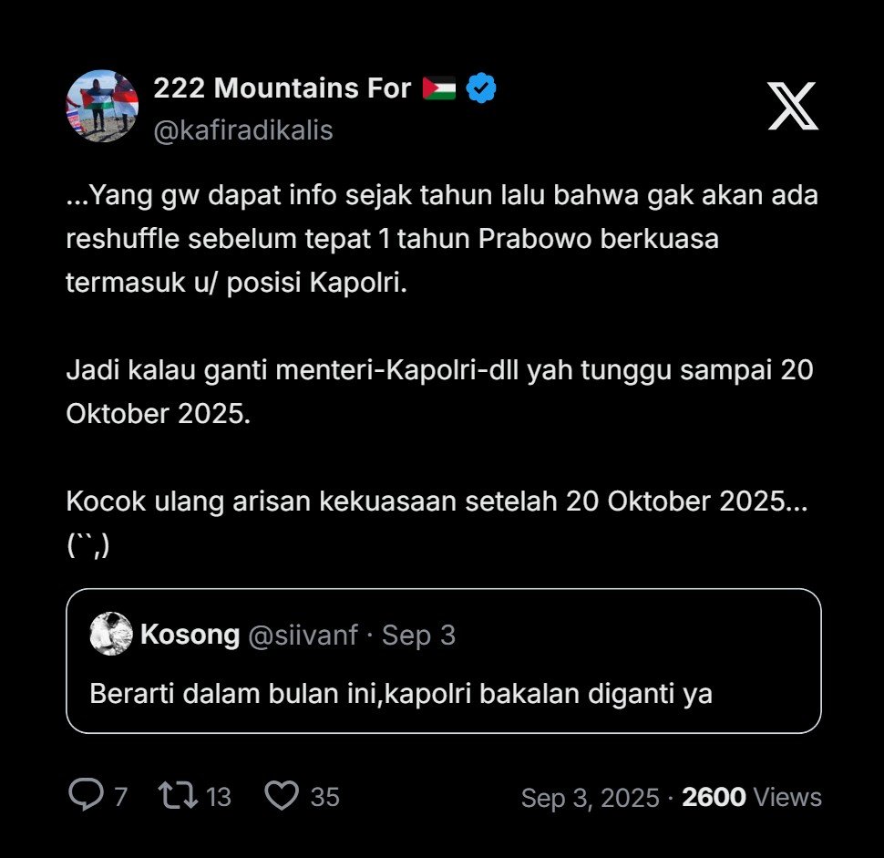 “Yang gw dapat info sejak tahun lalu bahwa gak akan ada reshuffle sebelum tepat 1 tahun Prabowo berkuasa termasuk u/ posisi Kapolri.