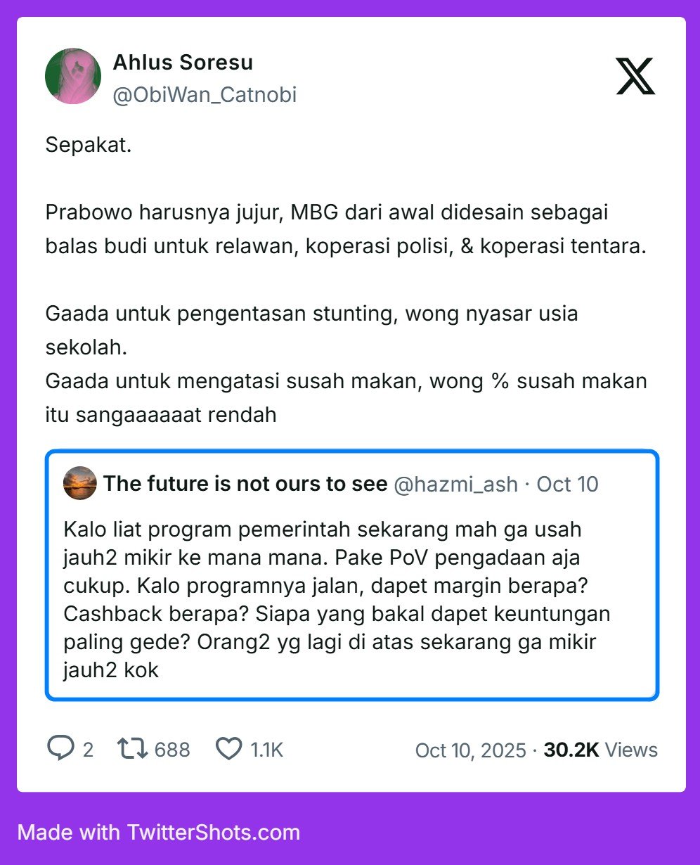 Prabowo harusnya jujur, MBG dari awal didesain sebagai balas budi untuk relawan, koperasi polisi, dan koperasi tentara.