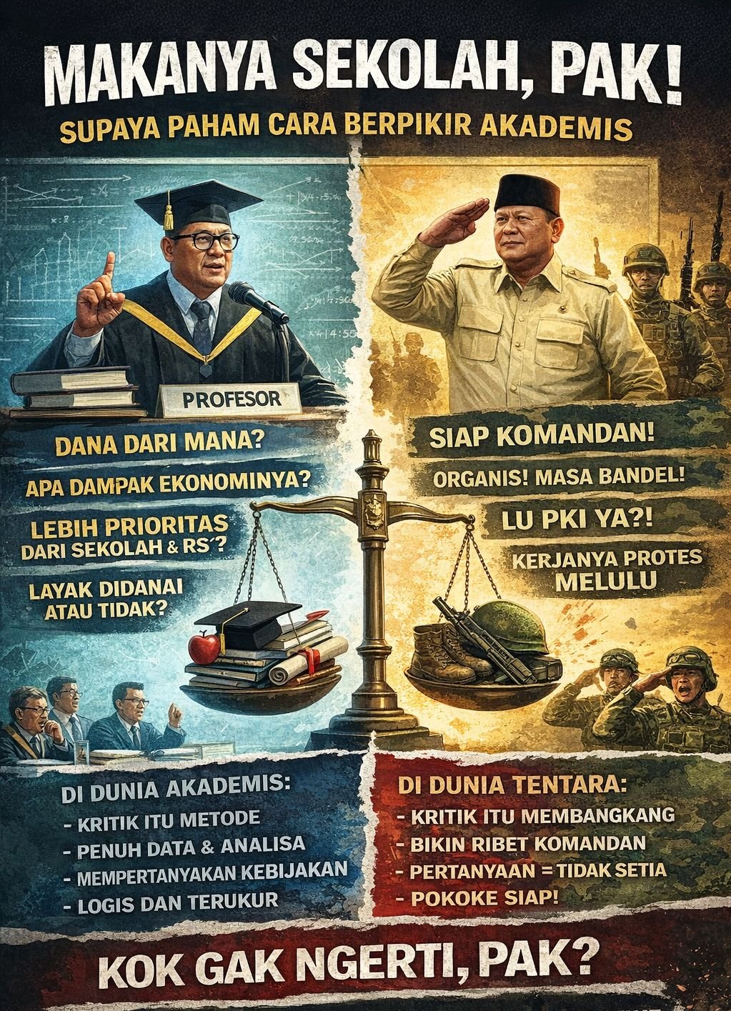Sebaliknya, kultur militer menempatkan perintah sebagai kebenaran yang harus dijalankan. Dalam sistem komando, perdebatan panjang dianggap memperlambat eksekusi. Dalam sistem akademik, justru perdebatan itulah yang menyelamatkan kebijakan dari kesalahan fatal.