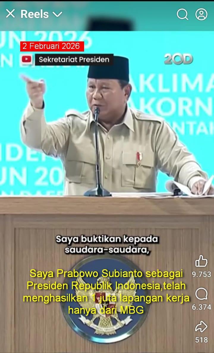 Presiden RI Prabowo Subianto menyatakan, program Makan Bergizi Gratis (MBG) telah menghasilkan 1 juta lapangan kerja dengan adanya sekitar 22.000 dapur MBG yang memproduksi dan mendistribusikan MBG.