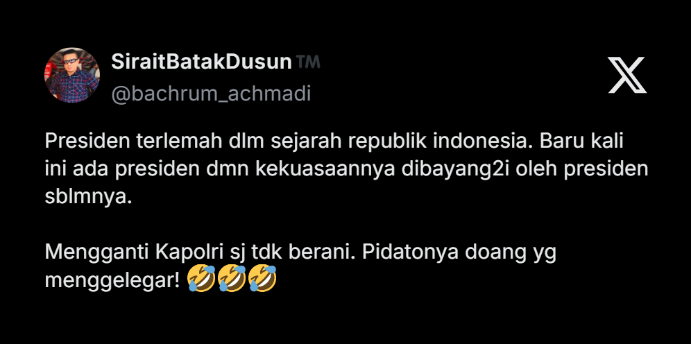 “Presiden terlemah dalam sejarah Republik Indonesia. Baru kali ini ada presiden dimana kekuasaannya dibayang-bayangi oleh presiden sebelumnya. Mengganti Kapolri saja tidak berani. Pidatonya doang yg menggelegar! 🤣🤣🤣,” ujar SiraitBatakDusun @bachrum_achmadi.