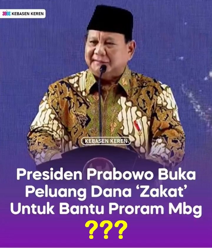 Presiden Prabowo Subianto menanggapi usulan untuk membiayai program Makan Bergizi Gratis (MBG) dari dana zakat. Prabowo tidak menjawab setuju tidaknya mengenai usulan itu, namun menurutnya zakat itu sudah diurus pihak lain.