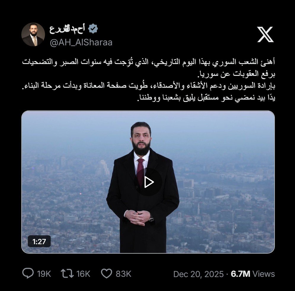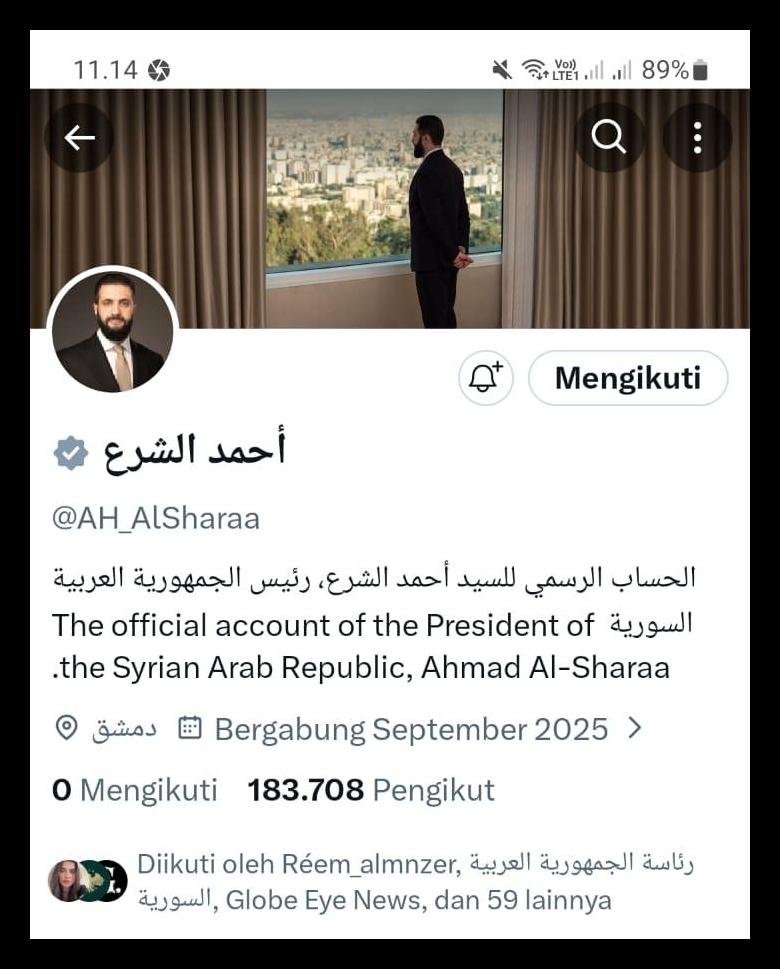 Hari ini, 20 Desember 2025, Presiden Suriah Ahmad al-Sharaa memposting perdana di akun resmi X (twitter) @AH_AlSharaa.