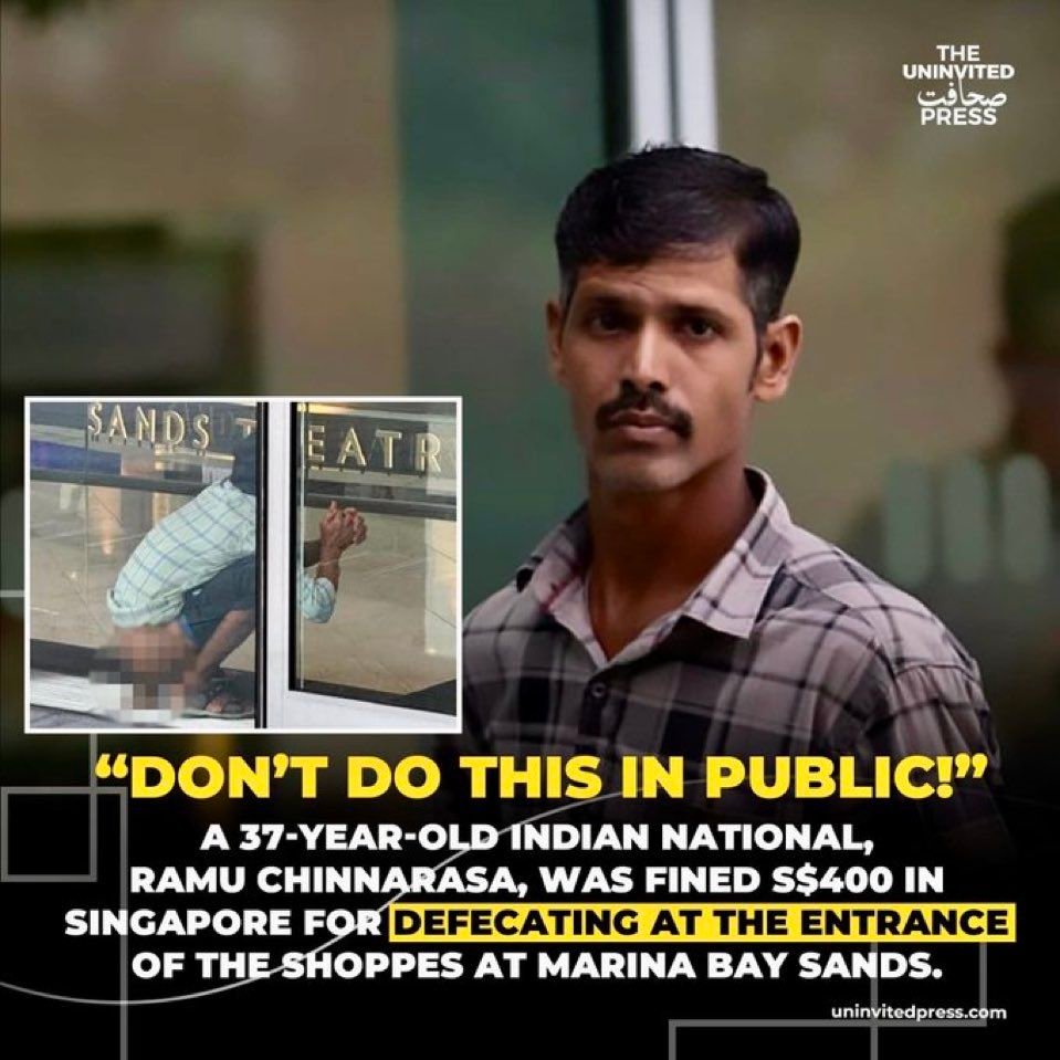 Seorang pekerja konstruksi asal India berusia 37 tahun, Ramu Chinnarasa, didenda S$400 (Rp 5,2 juta) oleh Pengadilan Singapura karena buang air besar di pintu masuk The Shoppes at Marina Bay Sands (MBS).