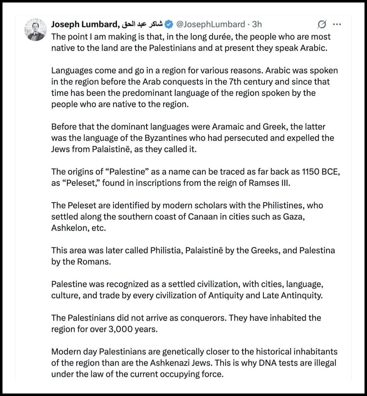 - Bangsa Palestina modern secara genetik lebih dekat dengan penduduk historis wilayah tersebut dibandingkan dengan Yahudi Ashkenazi.