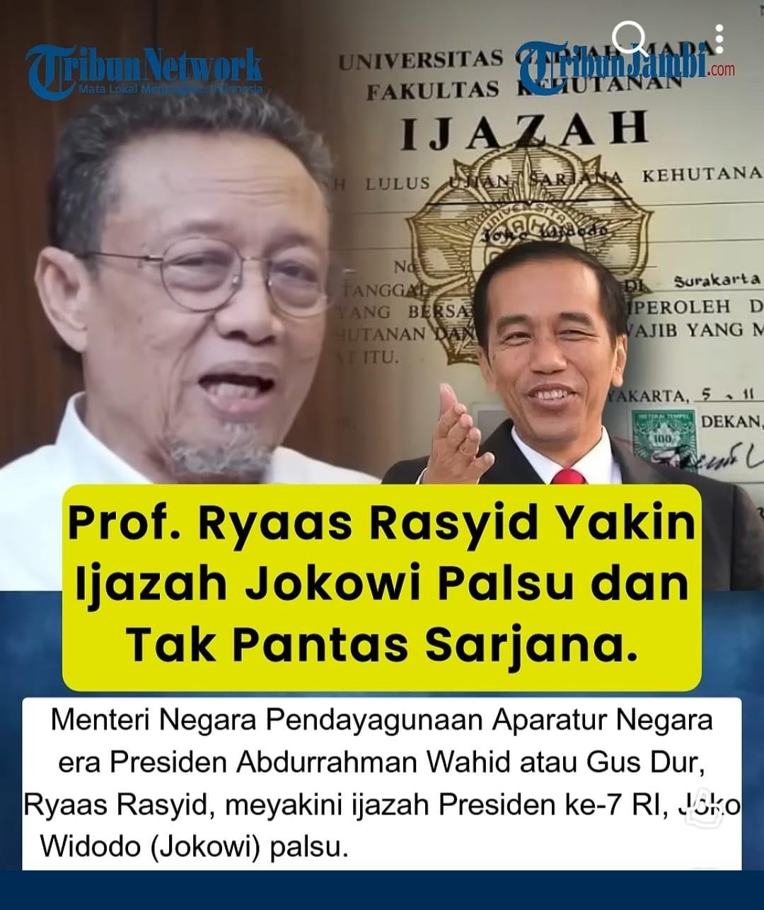 Mantan Menteri Negara Pendayagunaan Aparatur Negara, Prof. Dr. Ryaas Rasyid menyatakan keyakinannya bahwa Mantan Presiden Jokowi tidak memiliki ijazah asli.