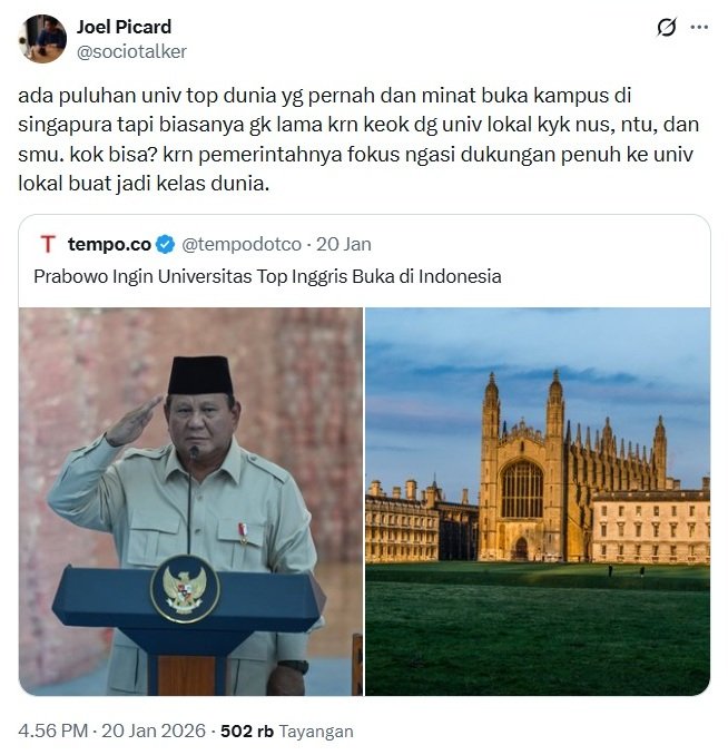 “Ada puluhan universitas top dunia yang pernah dan minat buka kampus di Singapura tapi biasanya gak lama karena keok dengan universitas lokal kayak NUS (National University of Singapore), NTU (Nanyang Technological University), dan SMU (Singapore Management University). Kok bisa? karena pemerintahnya fokus ngasih dukungan penuh ke universitas lokal buat jadi kelas dunia,” kata Prof. Sulfikar Amir di akun media sosialnya X @sociotalker.