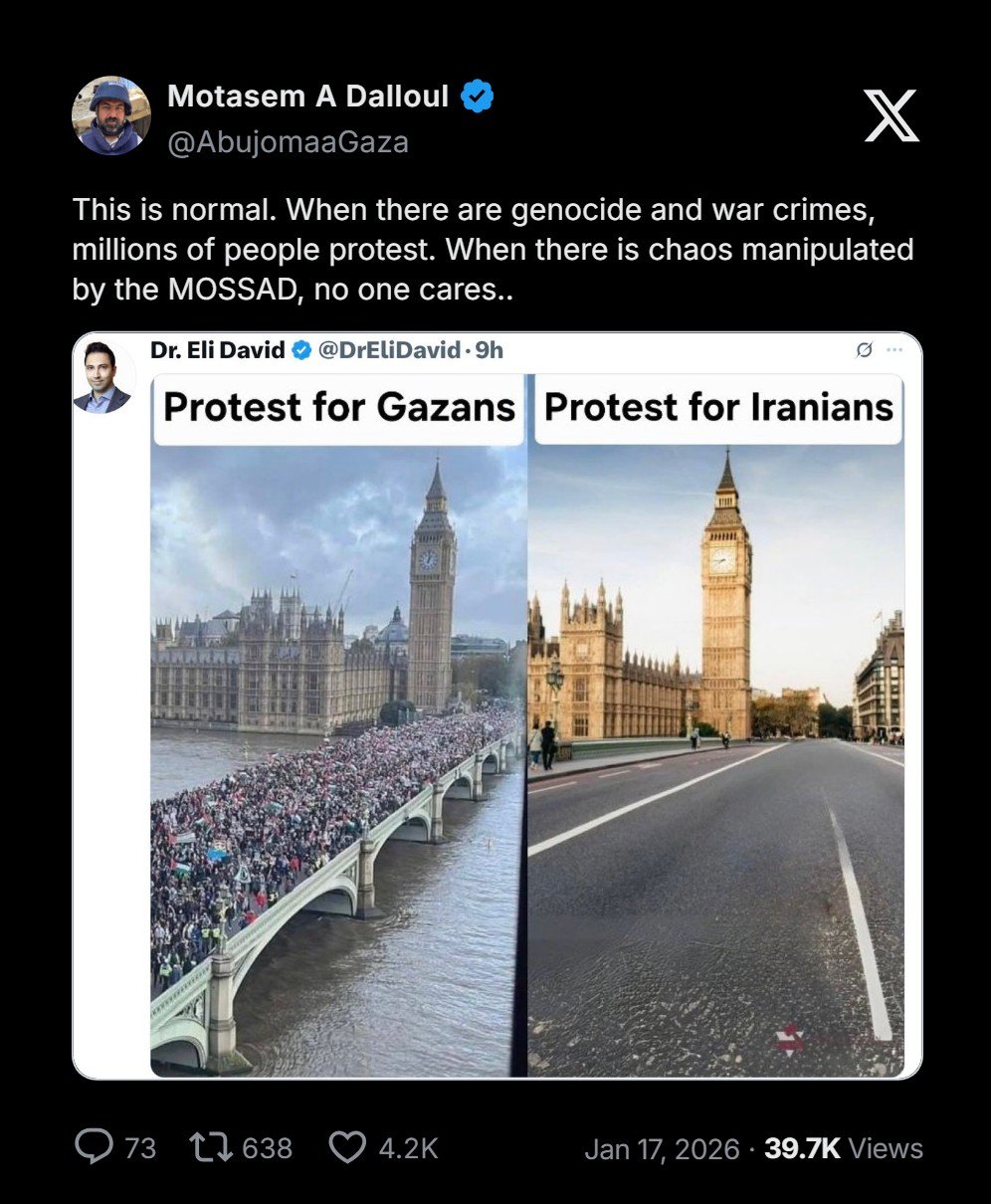 “Ini hal yang wajar. Ketika terjadi genosida dan kejahatan perang (Gaza), jutaan orang berdemonstrasi. Ketika terjadi kekacauan yang dimanipulasi oleh MOSSAD (Iran), tidak ada yang peduli.”