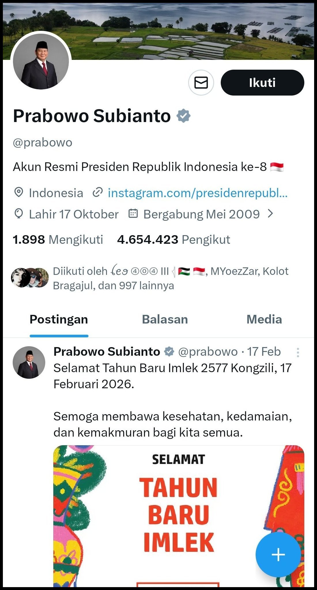 Di akun media sosial X (twitter), postingan terakhir Prabowo ucapan “Selamat Tahun Baru Imlek 2577 Kongzili, 17 Februari 2026. Semoga membawa kesehatan, kedamaian, dan kemakmuran bagi kita semua.”