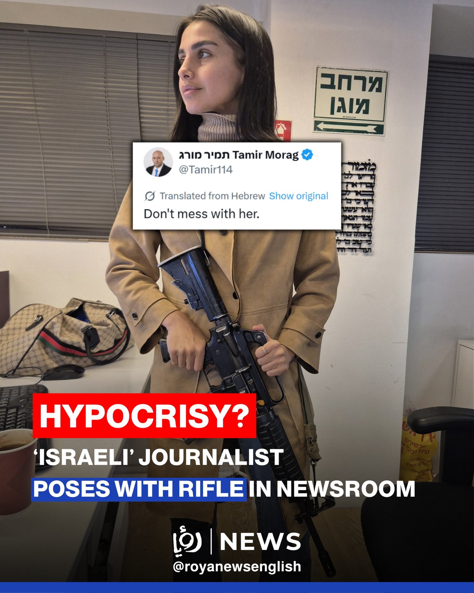 Maggie Tabibi, pembawa berita malam untuk Channel 14 Israel berbahasa Ibrani, difoto sedang memegang senapan serbu di tempat yang tampaknya merupakan kantor media jaringan tersebut.