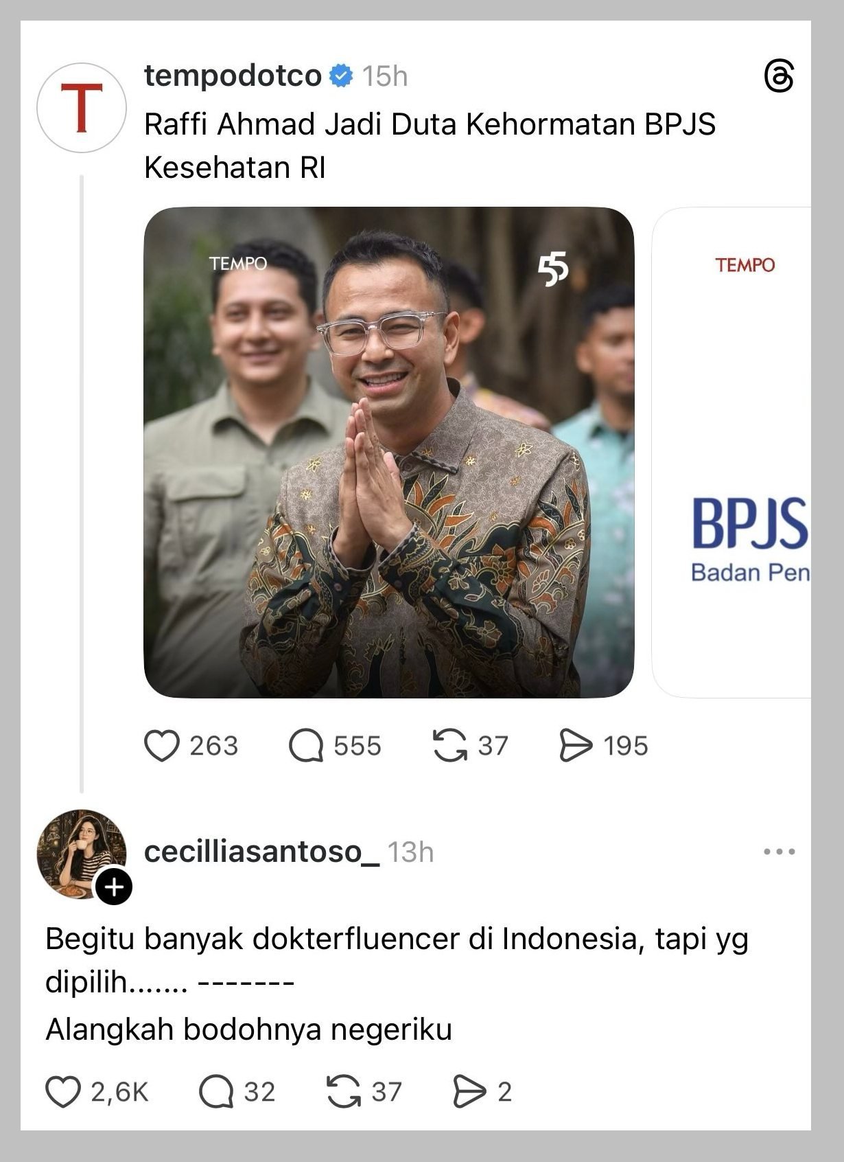 “Begitu banyak dokterfluencer (dokter yang juga influencer) di Indonesia, tapi yg dipilih….. alangkah bodohnya negeriku,” komen akun Threads @cecilliansantoso_.