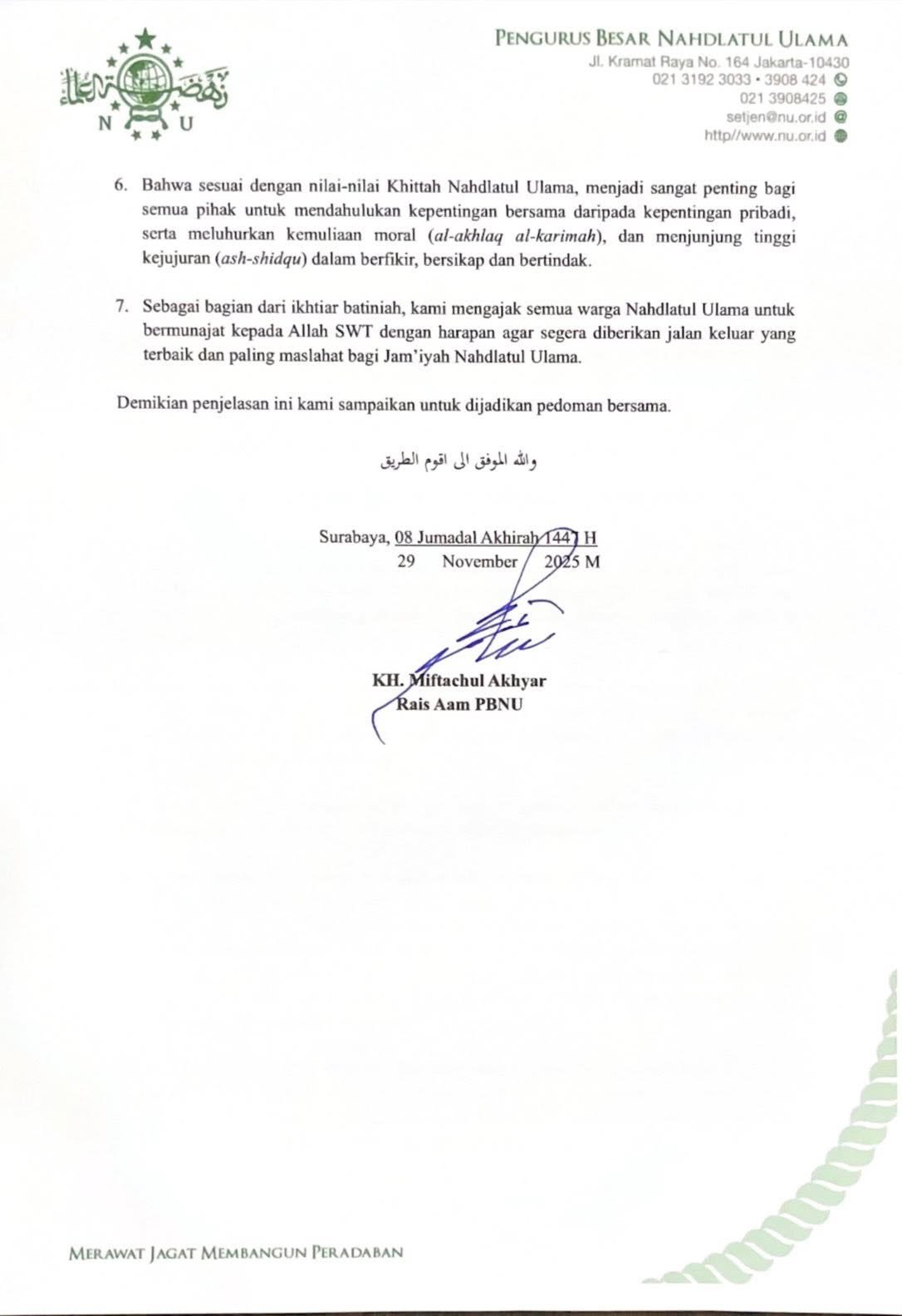 Hal itu diungkapkan, Rais Aam PBNU, KH Miftachul Akhyar usai bertemu para Syuriah PBNU dan 36 Pengurus Wilayah Nahdlatul Ulama (PWNU), di Kantor PWNU Jawa Timur (Jatim), Sabtu (29/11/2025).