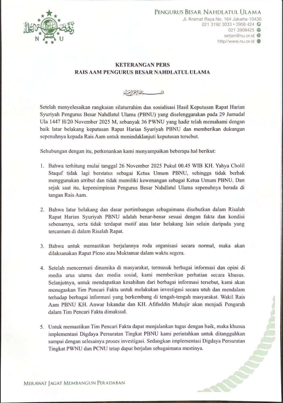 “Bahwa terhitung mulai tanggal 26 November 2025 Pukul 00.45 WIB, KH. Yahya Cholil Staquf tidak lagi berstatus sebagai Kctua Umum PBNU,” kata Miftachul Akhyar, dalam jumpa pers di Kantor PWNU Jatim, Sabtu (29/11/2025).