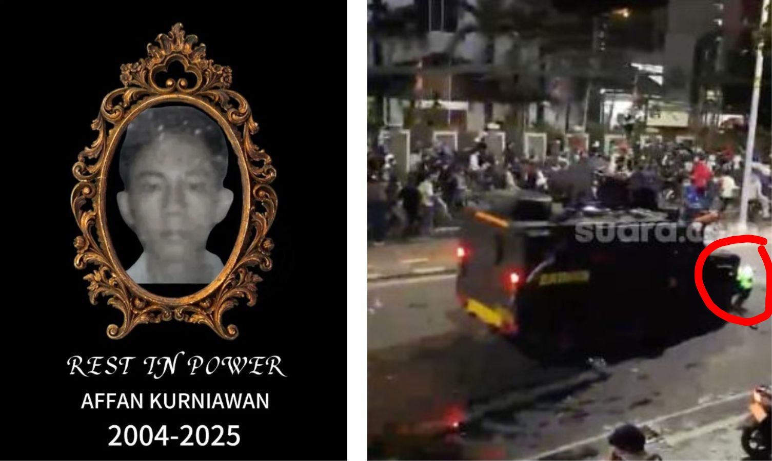 Pengemudi (driver) ojek online (ojol), Affan Kurniawan, tewas akibat dilindas kendaraan taktis (rantis) Brigade Mobile (Brimob) saat demonstrasi di Jakarta, Kamis 28 Agustus 2025 malam. Affan dikenal sebagai sosok yang rajin, baik, dan menjadi tulang punggung bagi keluarganya.