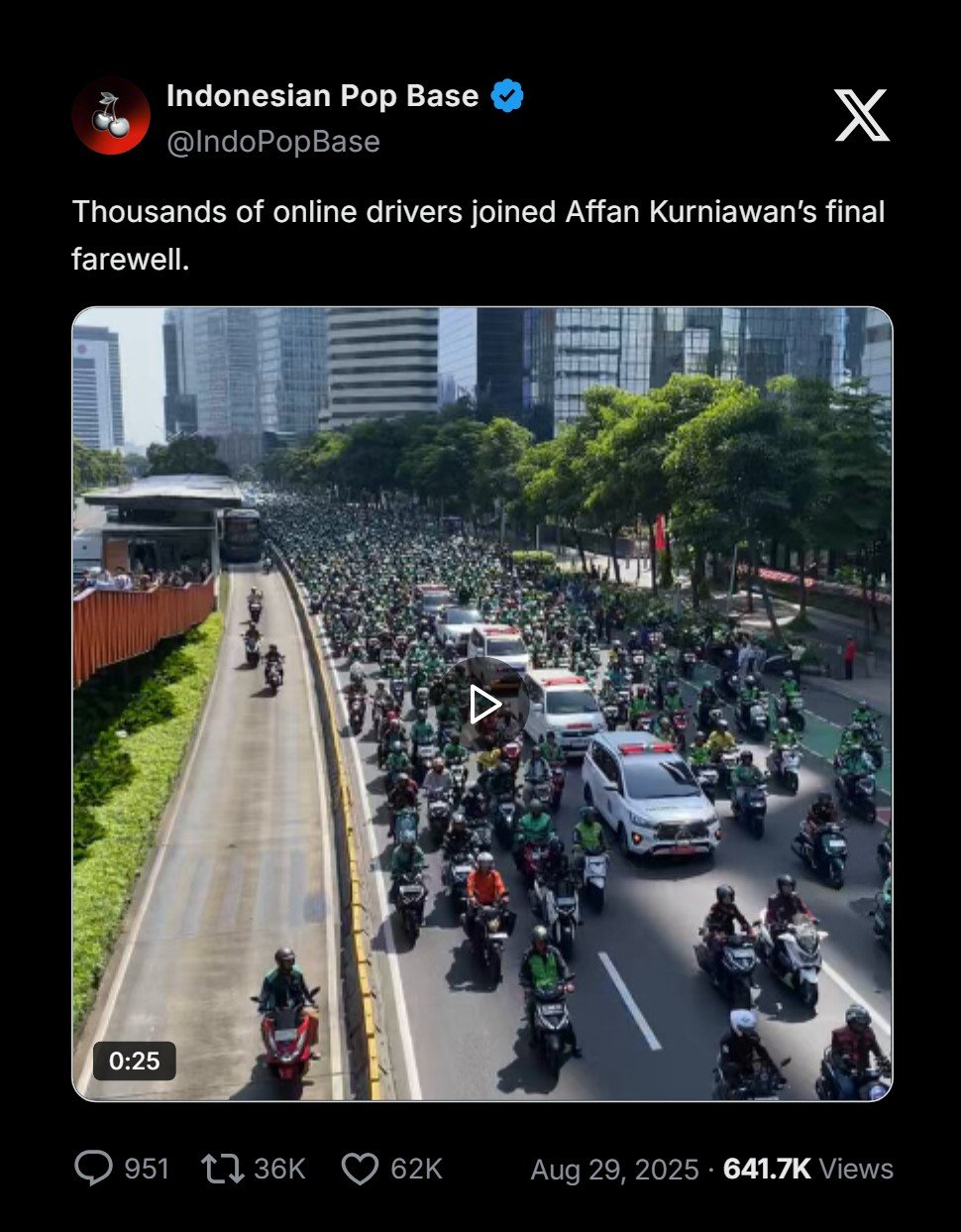Pengemudi (driver) ojek online (ojol), Affan Kurniawan, tewas akibat dilindas kendaraan taktis (rantis) Brigade Mobile (Brimob) saat demonstrasi di Jakarta, Kamis 28 Agustus 2025 malam. Affan dikenal sebagai sosok yang rajin, baik, dan menjadi tulang punggung bagi keluarganya.