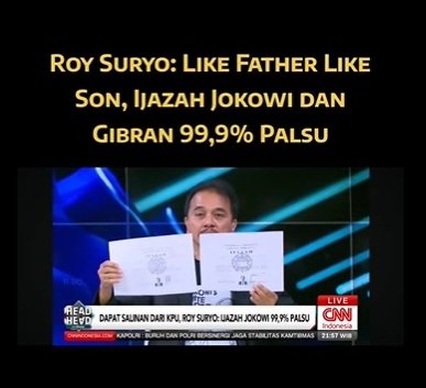 “Jadi bapak dan anak sama saja, like father like son, buah itu jatuh tidak jauh dari pohonya, dua-duanya ijazahnya 99,9 persen palsu !!!” tandas Roy Suryo.