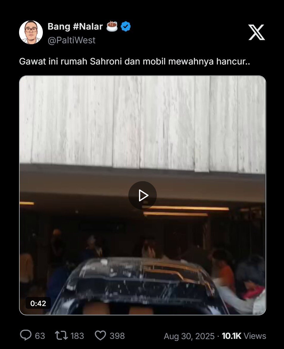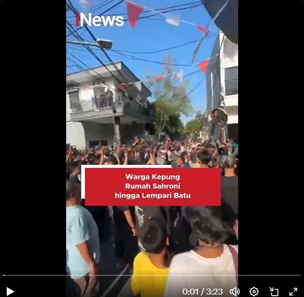 Massa menggeruduk rumah Sahroni di Tanjung Priok pada sore ini (Sabtu, 30/8/2025), dan menjarah isi kediamannya. Peristiwa ini disiarkan langsung melalui salah satu akun TikTok, @cukupsatu_selamanya, dan ditonton hingga 1,5 juta orang.