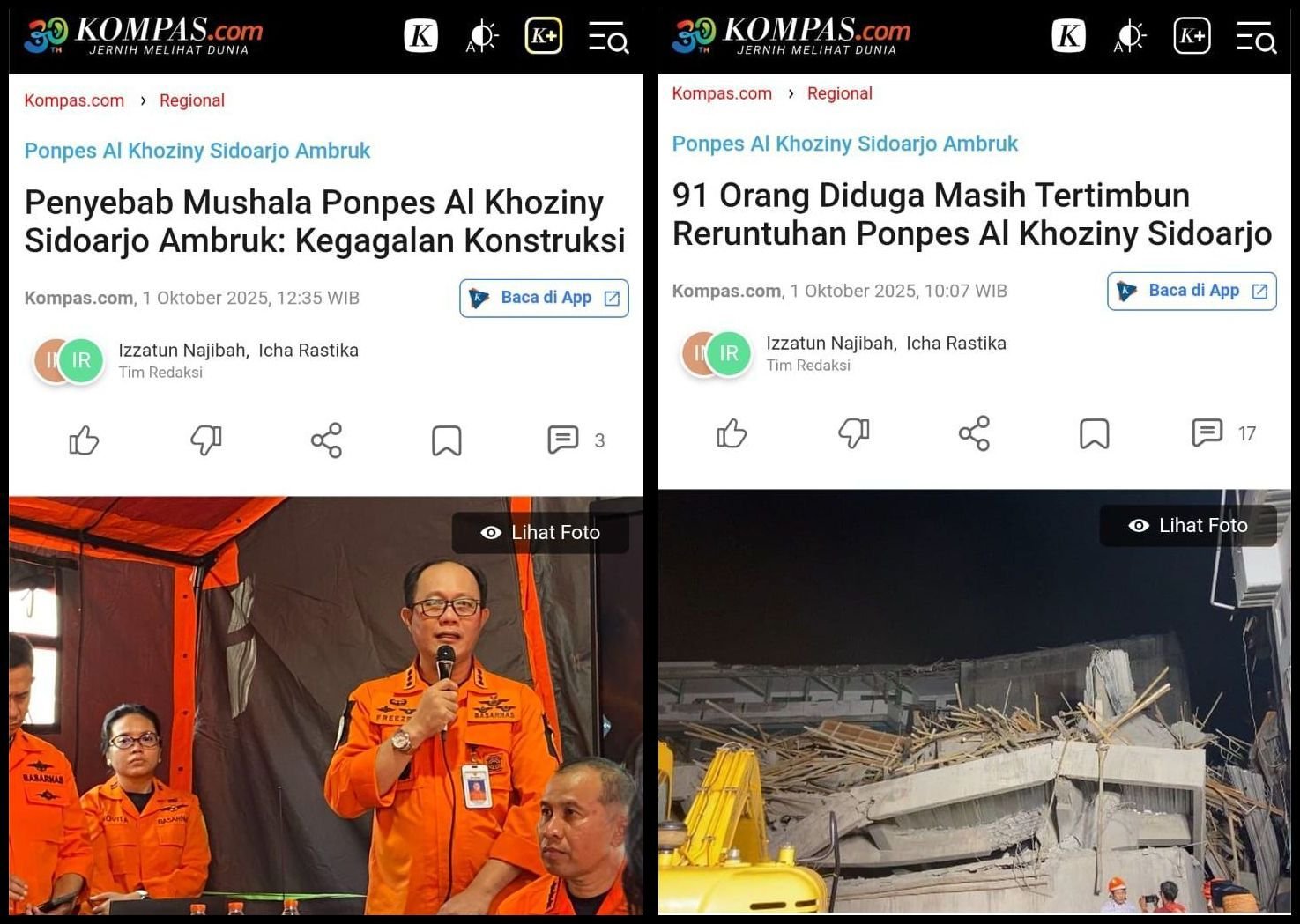 Sebanyak 91 orang diperkirakan masih tertimbun di dalam reruntuhan bangunan Pondok Pesantren (Ponpes) Al Khoziny Sidoarjo, Jawa Timur.