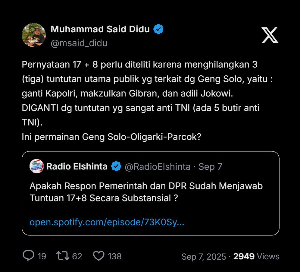 “Pernyataan 17 + 8 perlu diteliti karena menghilangkan 3 (tiga) tuntutan utama publik yg terkait dg Geng Solo, yaitu : ganti Kapolri, makzulkan Gibran, dan adili Jokowi.