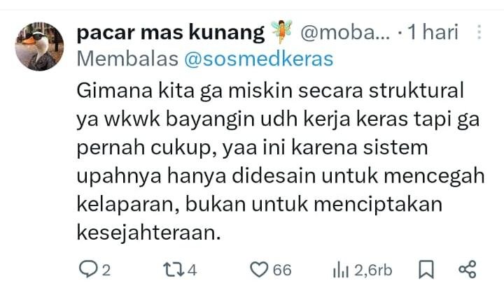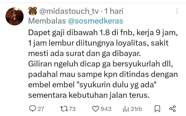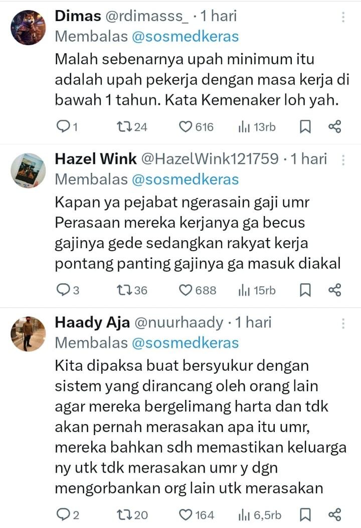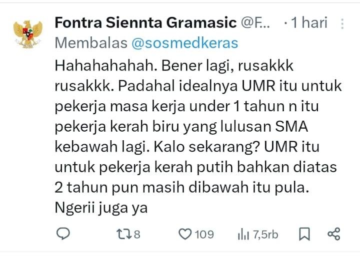 “Hahahahahah. Bener lagi, rusakkk rusakkk. Padahal idealnya UMR itu untuk pekerja masa kerja under 1 tahun n itu pekerja kerah biru yang lulusan SMA kebawah lagi. Kalo sekarang? UMR itu untuk pekerja kerah putih bahkan diatas 2 tahun pun masih dibawah itu pula. Ngerii juga ya.” (@FelixSGL1)