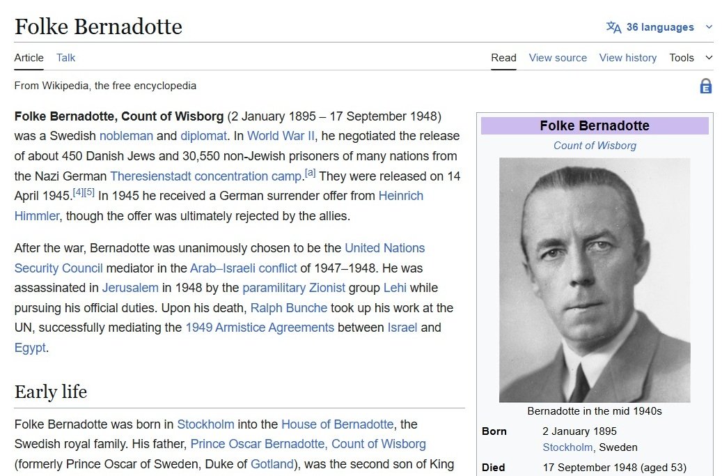 “Yang menarik perhatian saya dalam foto ini adalah adanya jalan yang diberi nama Count Bernadotte: ia adalah diplomat Swedia yang menyelamatkan 31.000 orang Yahudi dari kamp konsentrasi Nazi, menjadi mediator pertama PBB di Palestina, mendukung hak kembali warga Palestina dan kemudian pada tahun 1948 dibunuh di Yerusalem oleh Geng Stern Zionis.”