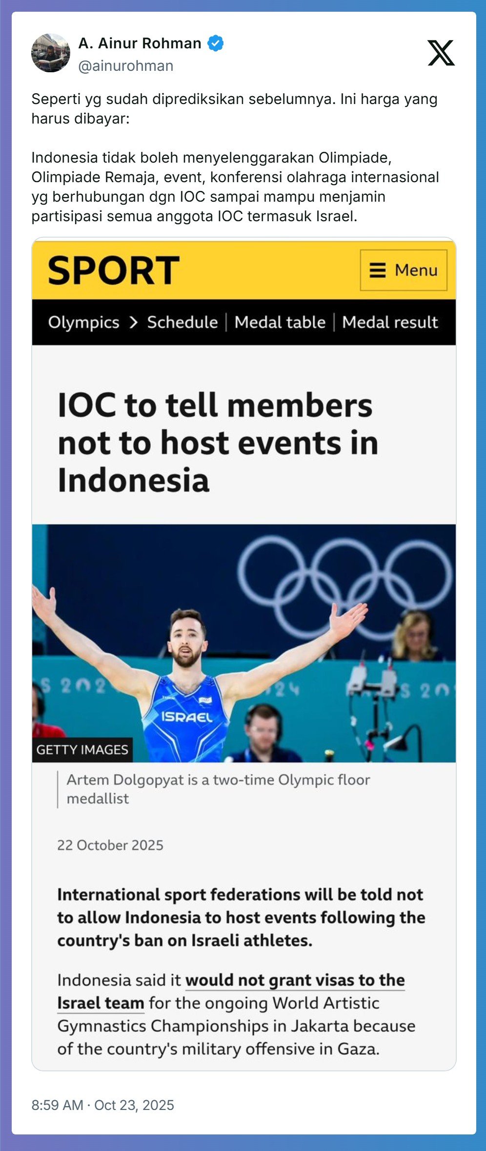 “Menyusul pembatalan visa atlet Israel oleh pemerintah Indonesia untuk Kejuaraan Dunia Senam Artistik FIG ke-53 di Jakarta, Dewan Eksekutif IOC bertemu secara daring minggu ini dan membahas situasi khusus ini serta isu global yang berulang terkait akses atlet ke kompetisi internasional.”