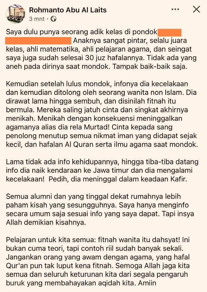 Kemudian setelah lulus mondok, infonya dia kecelakaan dan kemudian ditolong oleh seorang wanita non Islam. Dia dirawat lama hingga sembuh, dan disinilah fitnah itu bermula. Mereka saling jatuh cinta dan singkat akhirnya menikah. Menikah dengan konsekuensi meninggalkan agamanya alias dia rela Murtad! Cinta kepada sang penolong menutup semua nikmat iman yang didapat sejak kecil, dan hafalan Al Quran serta ilmu agama saat mondok.