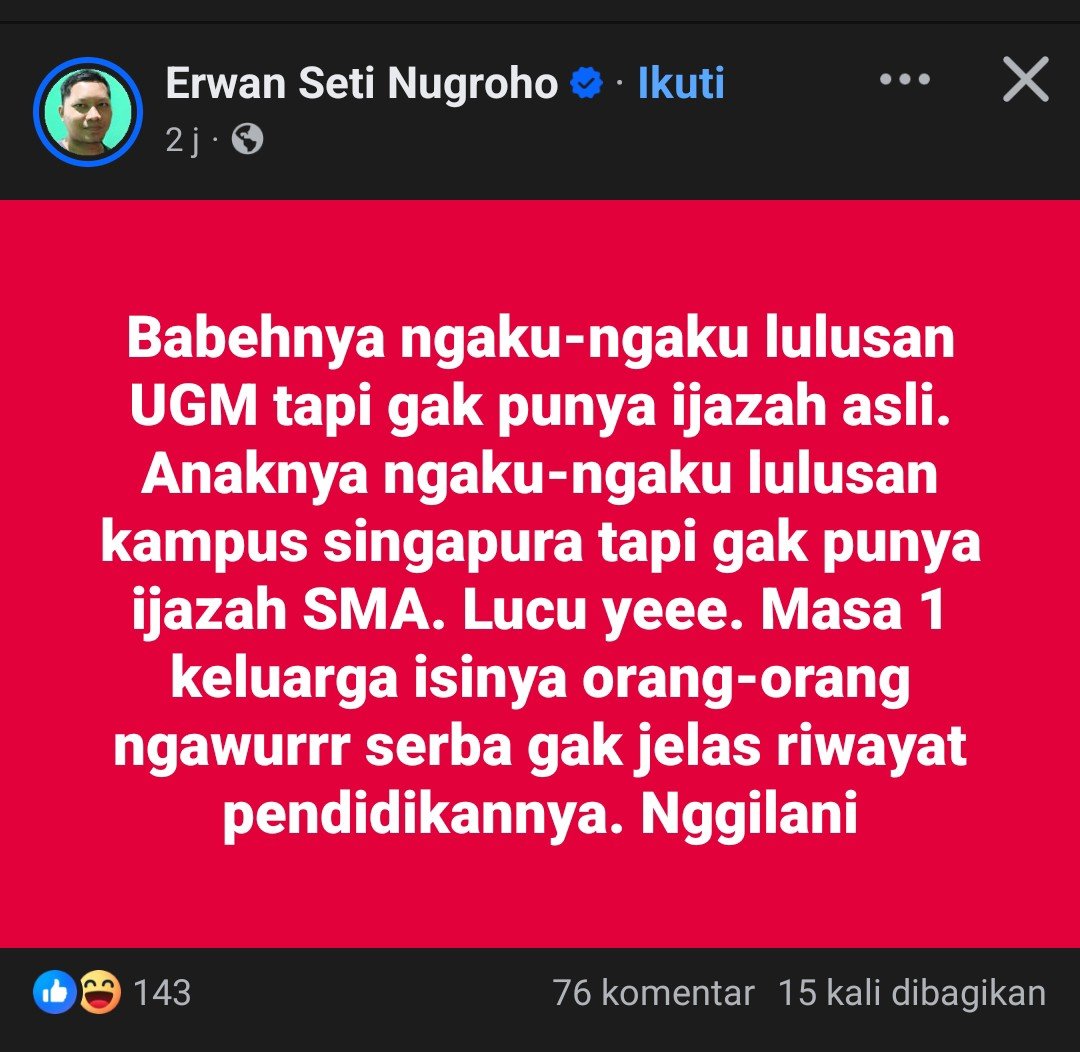 Babehnya ngaku-ngaku lulusan UGM tapi gak punya ijazah asli. Anaknya ngaku-ngaku lulusan kampus singapura tapi gak punya ijazah SMA. Lucu yeee. Masa 1 keluarga isinya orang-orang ngawurrr serba gak jelas riwayat pendidikannya. Nggilani.