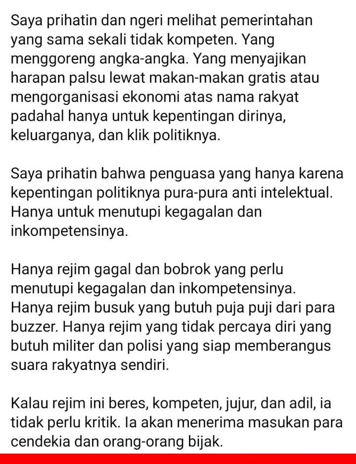 Saya prihatin dan ngeri melihat pemerintahan yang sama sekali tidak kompeten. Yang menggoreng angka-angka. Yang menyajikan harapan palsu lewat makan-makan gratis atau mengorganisasi ekonomi atas nama rakyat padahal hanya untuk kepentingan dirinya, keluarganya, dan klik politiknya.